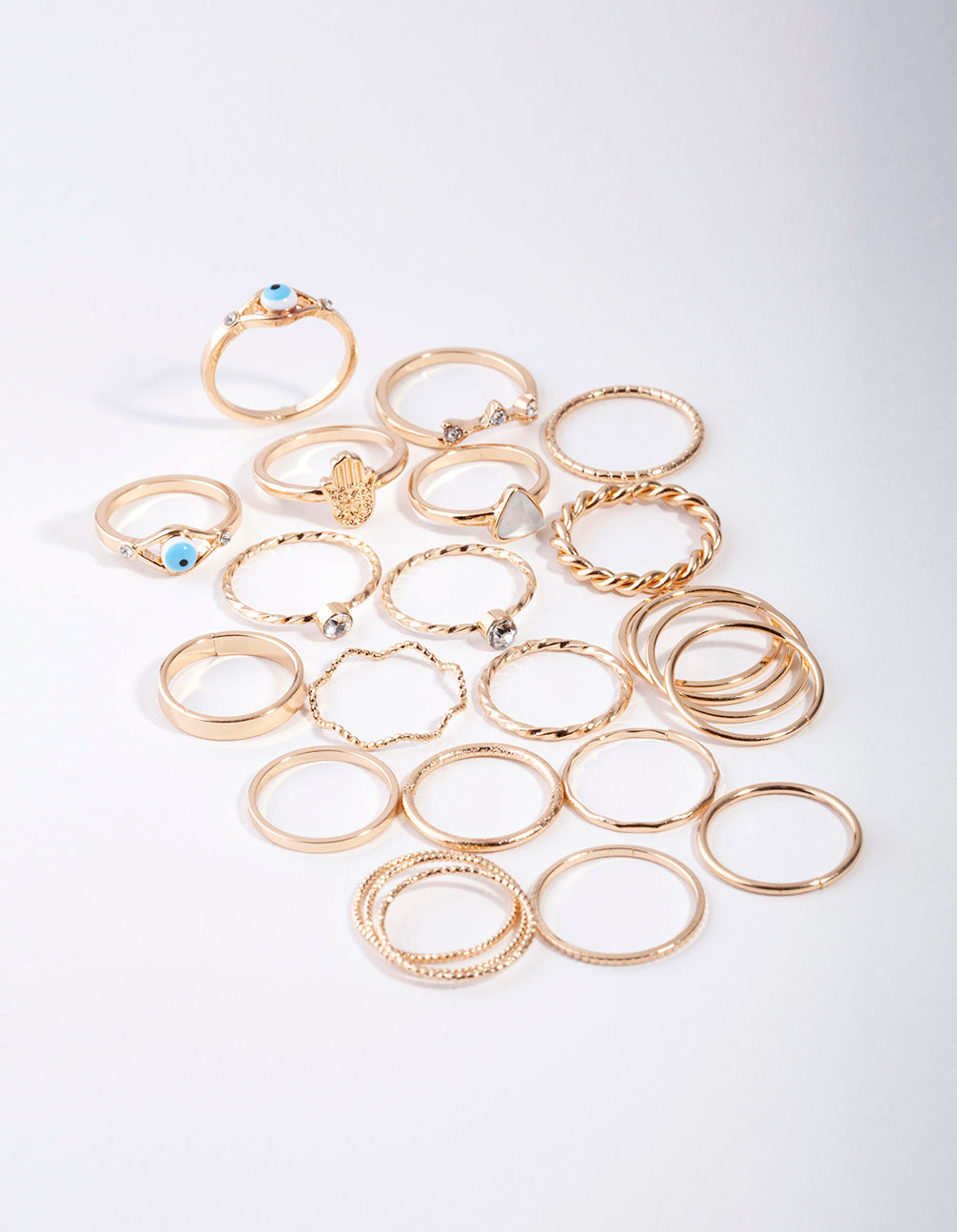 Mix it up with this gorgeous pack of gold-toned rings! It features 24 rings that are perfect for stacking, mixing and matching! Designs motifs include the evil eye and hamsa hand.