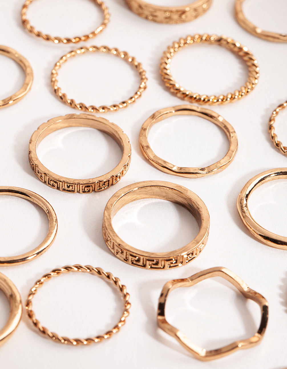 Mix them, match them, stack them, curate them! This ring pack is perfect for creating a layered look! It includes 22 gold-toned rings with various band designs. Wear them all together for maximum impact!