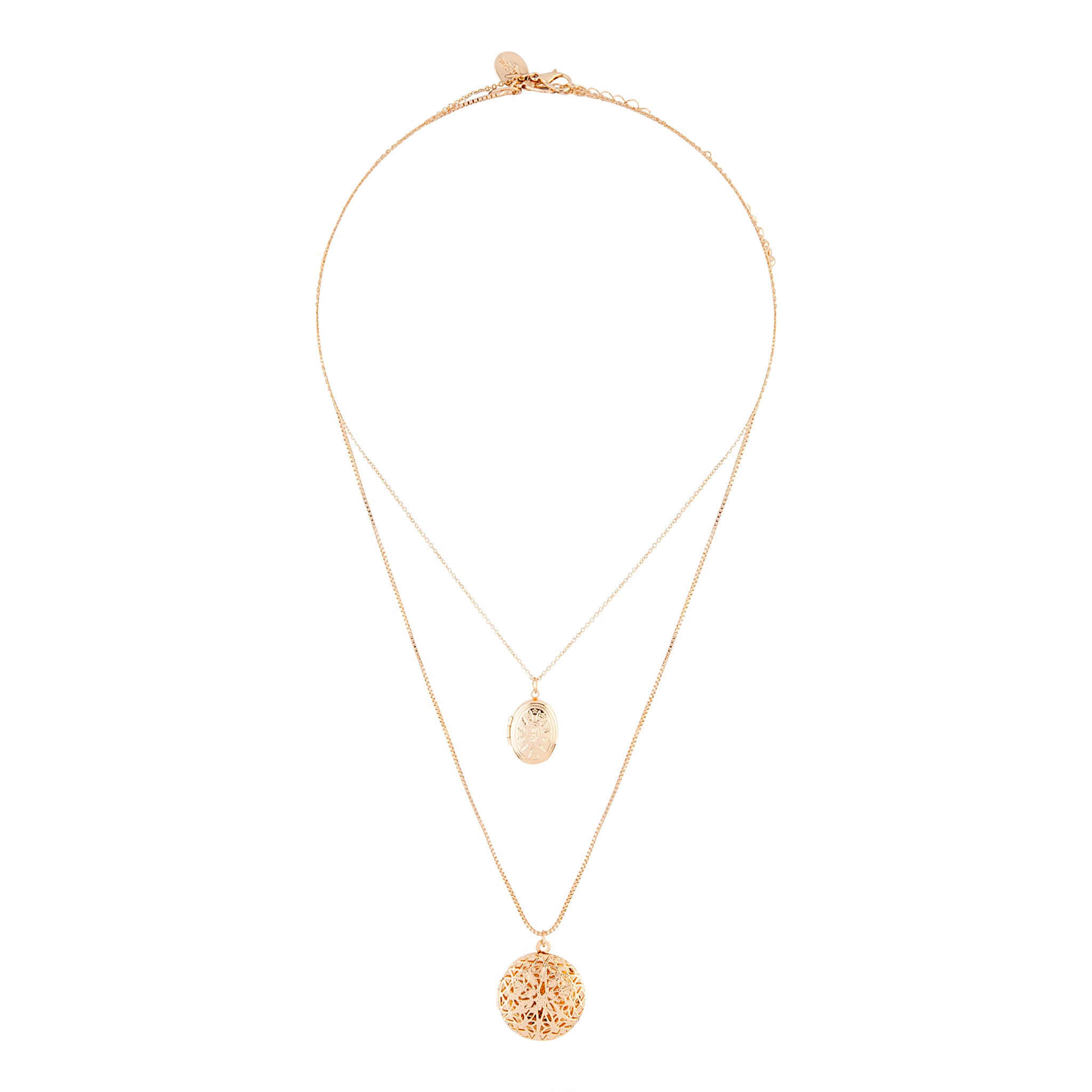 A duet of gold chain necklaces with locket pendants.