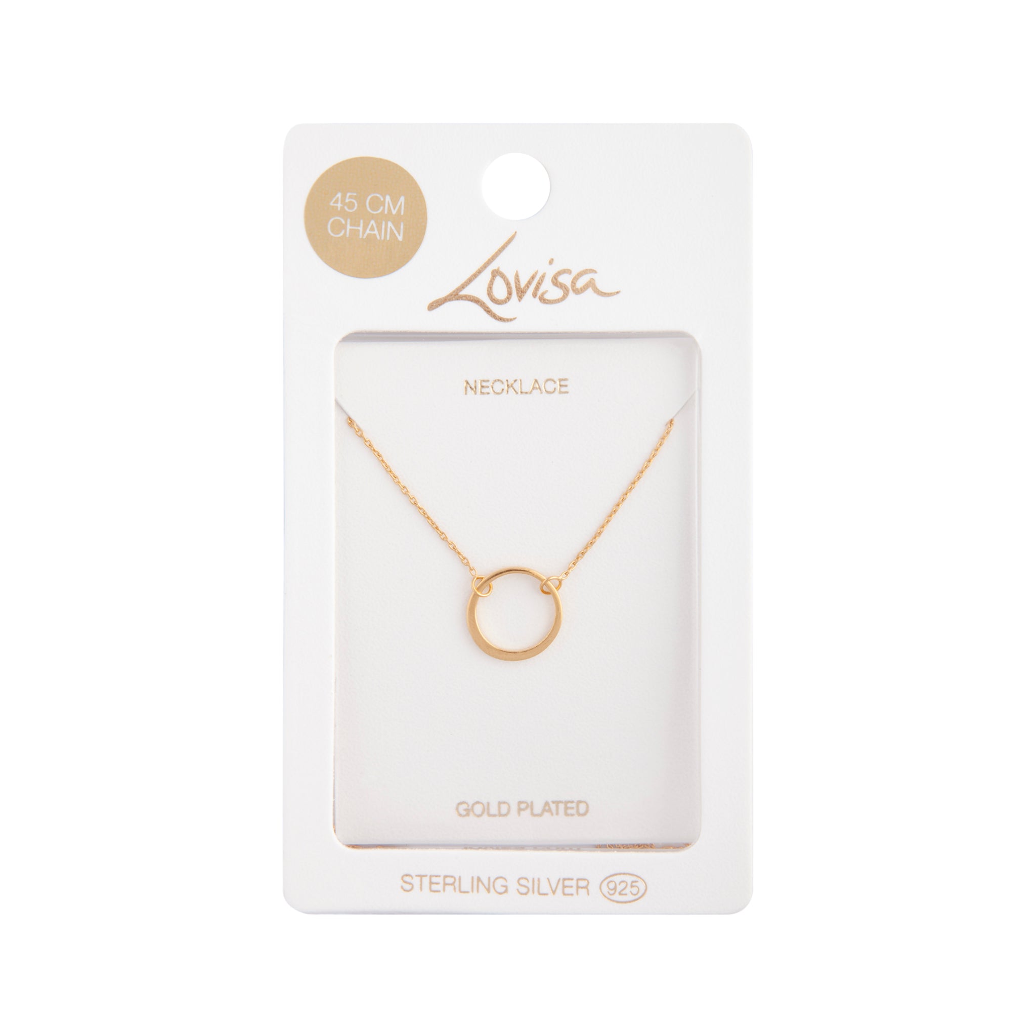 An open circle pendant measuring at 1.3cm on a fine 45cm gold plated sterling silver chain.