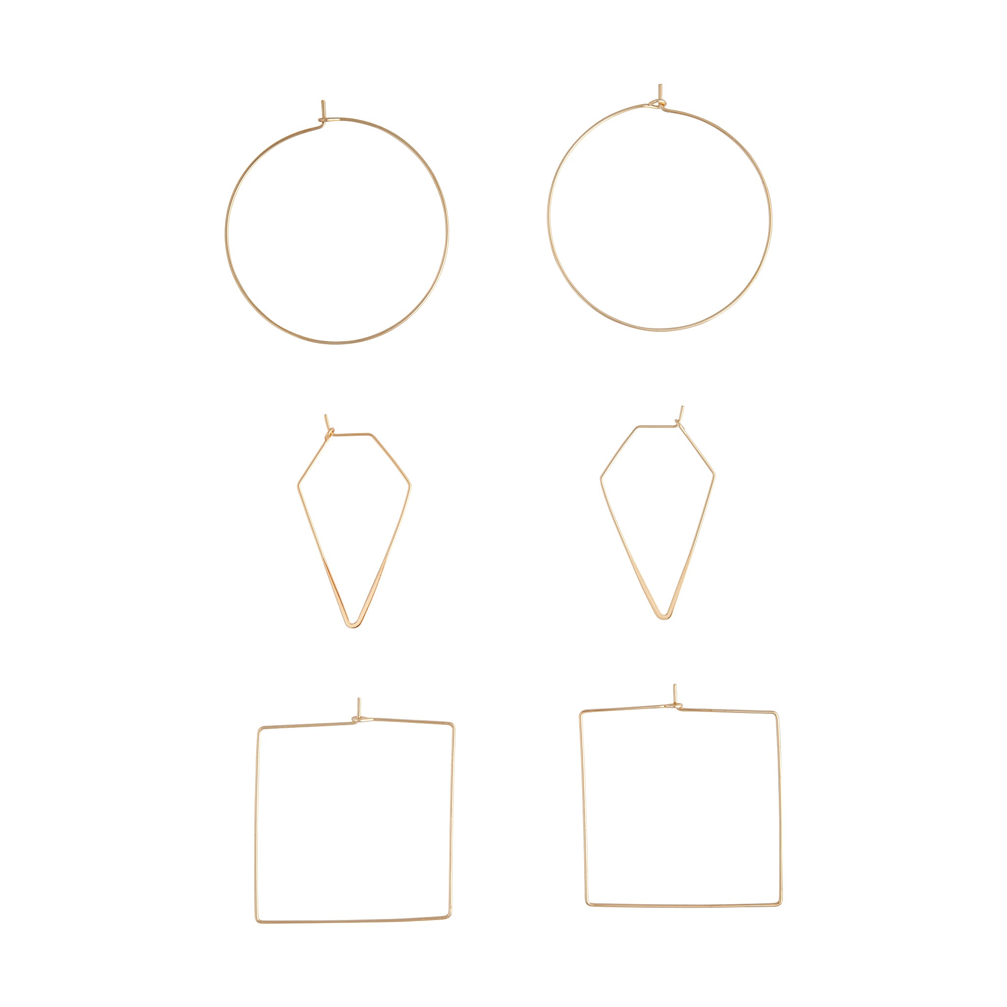A trio of fine hoop earrings in a variety of geometric designs.