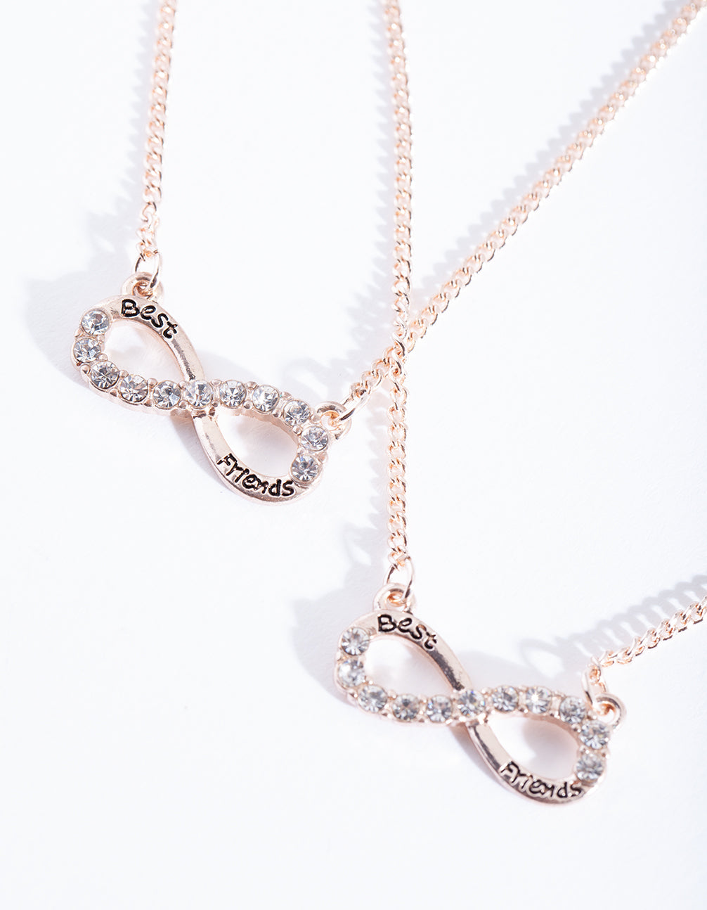 Shareable, giftable and packed in pretty packaging. Lovisa gift-boxes take the stress out of giving. This set boasts a duet of rose-gold-toned necklaces with diamante embellished infinity pendants that say the words "Best" and "Friends".