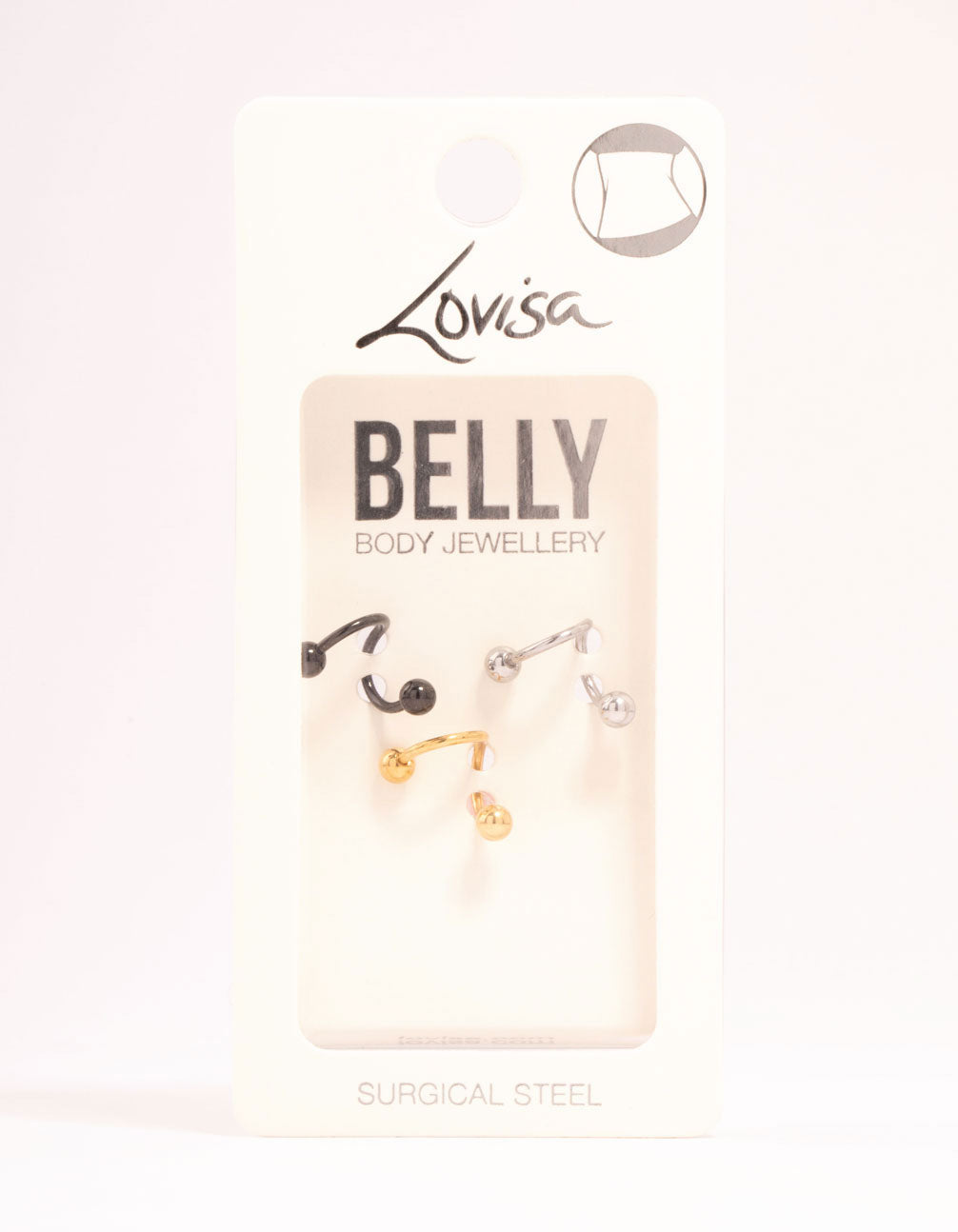 Twist and turn with confidence in this trio of belly button bars! Featuring sleek, twisted designs in gold, silver and black, these piercings add an edgy touch to any crop top or bikini look.