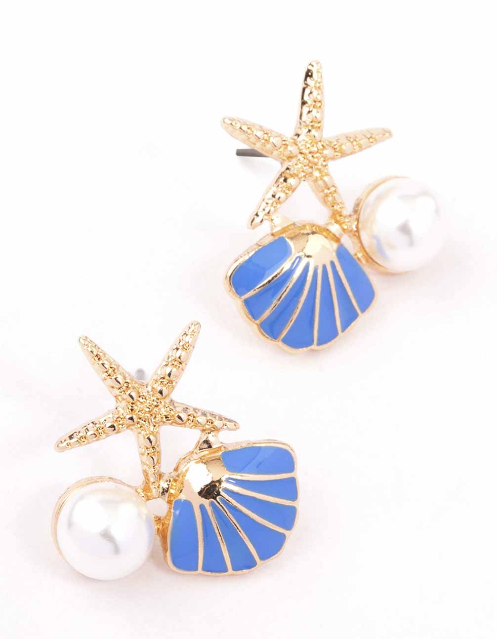 Gold & Blue Starfish Pearl Cluster Stud Earrings