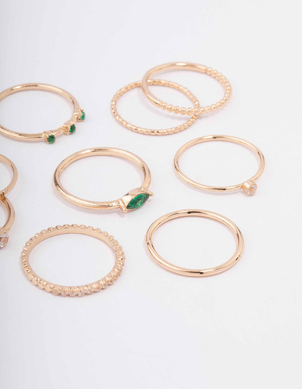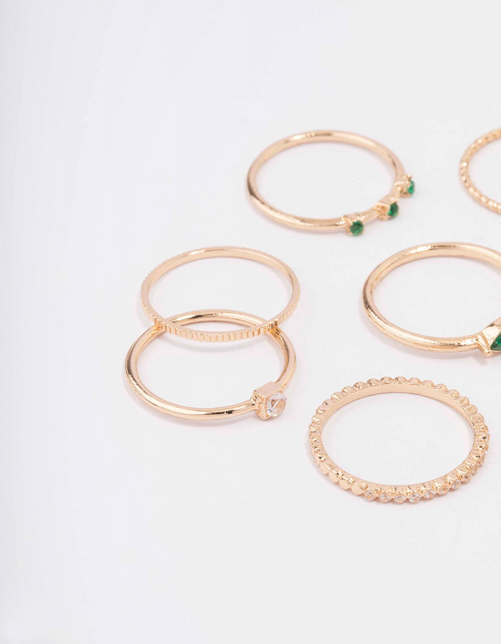 Embellish your stack with this set of cubic zirconia encrusted rings. This pack of gold stacking rings contains a mix of rings in varying shapes and silhouettes.