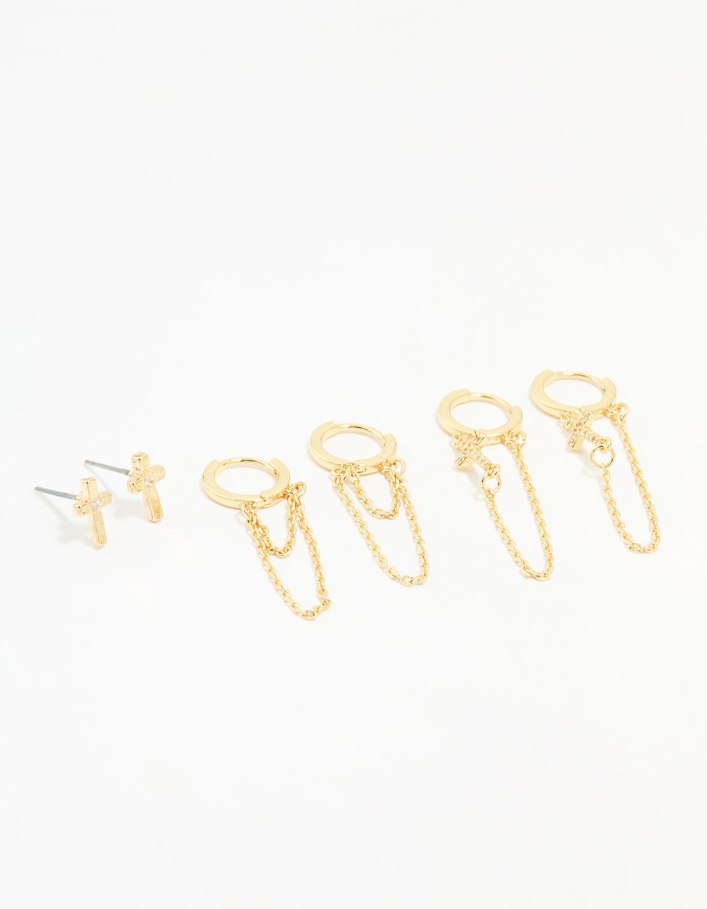 Gold Cubic Zirconia Loop Chain Cross Earrings 3-Pack