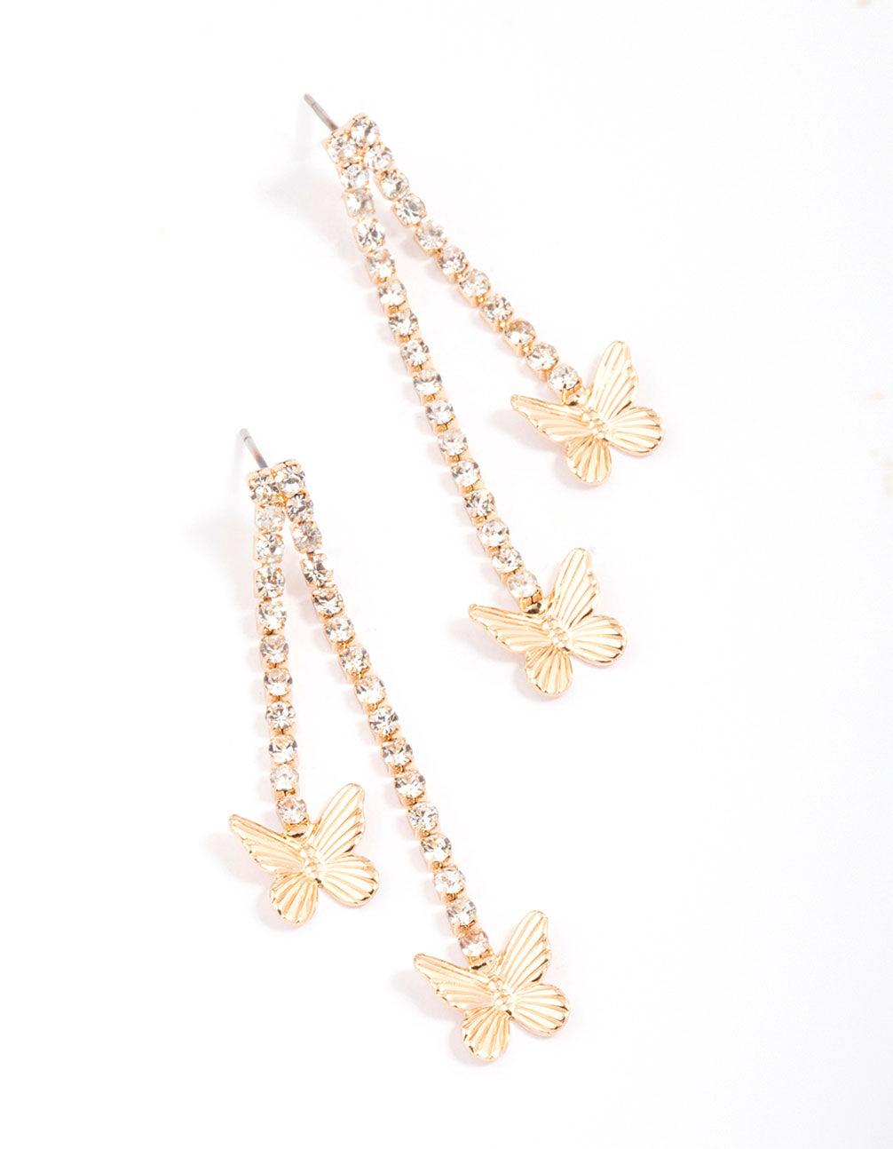 These earrings feature a cup chain design, encrusted with delicate diamantes and butterfly motifs for a whimsical finish.