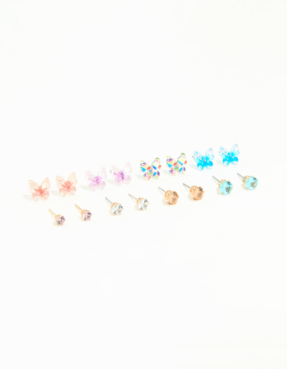 Add a touch of whimsy to your look with this Gold Diamante & Butterfly Stud Earrings Pack. Featuring a mix of sparkling pink, topaz, and blue diamante studs, plus playful butterfly designs in rainbow, purple, pink, and blue, this versatile set is perfect for mixing and matching. Whether you're heading to brunch or a night out, these gold-toned earrings are an effortless way to add shimmer and charm to any outfit. Pair them with a flowy dress for a dreamy vibe or dress up your everyday jeans and tee. Perfect for stacking or wearing solo, they're a must-have for any jewellery lover!