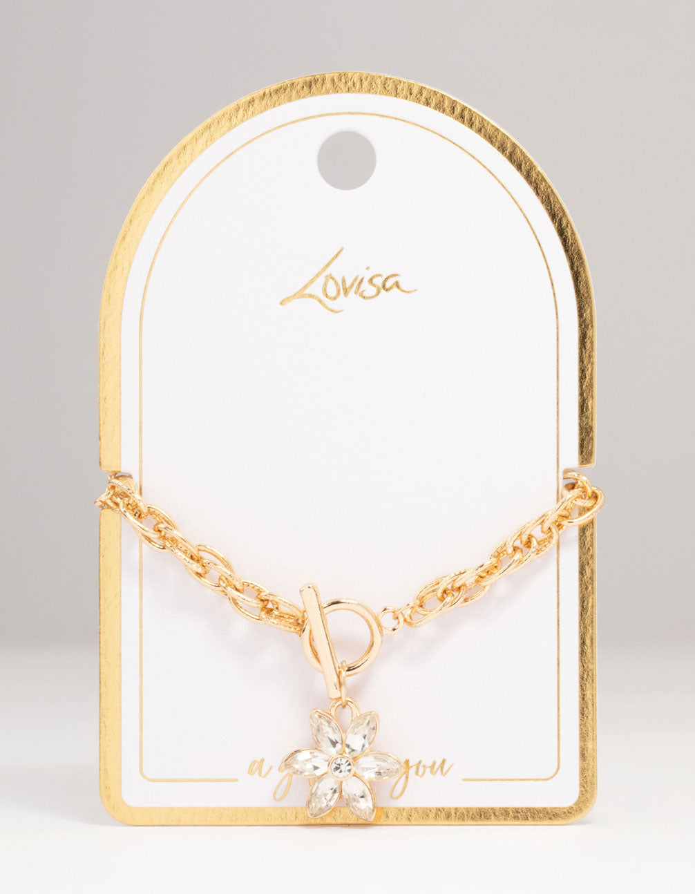 Add a touch of sparkle to your wrist with this Gold Diamante Flower Charm T & O Bracelet. This playful yet elegant bracelet features a charming flower design adorned with dazzling diamantes, making it perfect for any jewellery lover. With its gold-tone finish and timeless appeal, this piece is ideal for dressing up casual outfits or adding extra glamour to evening wear. Whether you're heading to brunch with friends or a special event, this bracelet is a versatile wristwear staple that pairs beautifully with everything from flowy dresses to tailored blazers. A must-have accessory for anyone who loves chic, stylish bracelets!