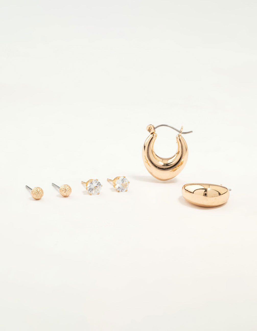 Upgrade your earring game with this chic trio! Featuring gold toned diamante studs, sleek hoops, and textured ball studs, it's a must-have for any look.