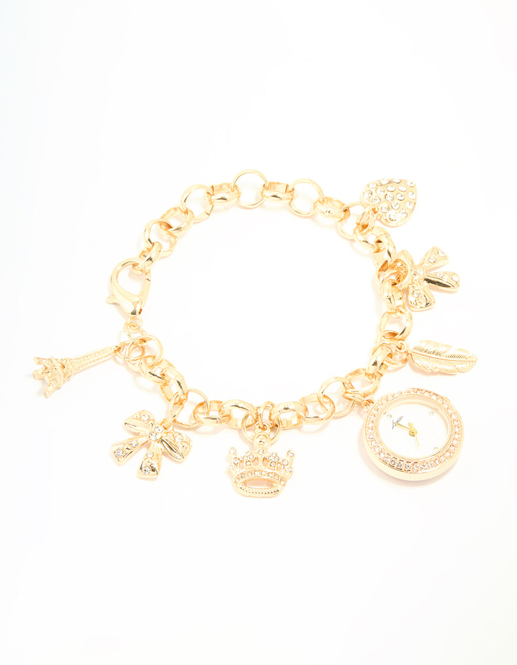Stay stylish and on time with this Gold Diamante Watch & Feather Charm Bracelet. This gold-tone charm bracelet blends elegance and playfulness, featuring a functional watch charm encrusted with sparkling diamante crystals, alongside a whimsical mix of charms: a heart, phone, bow, feather, crown, bow centre, and even an Eiffel Tower! With its dazzling cubic zirconia crystals and intricate details, this bracelet is a jewellery box must-have. Whether you're dressing up for brunch, a party, or a casual outing, it's the perfect accessory to elevate your look. Pair it with a flowy dress or your favourite jeans-and-blouse combo for effortless chic vibes. Looking for a versatile gift? This bracelet ticks all the boxes—style, function, and charm!