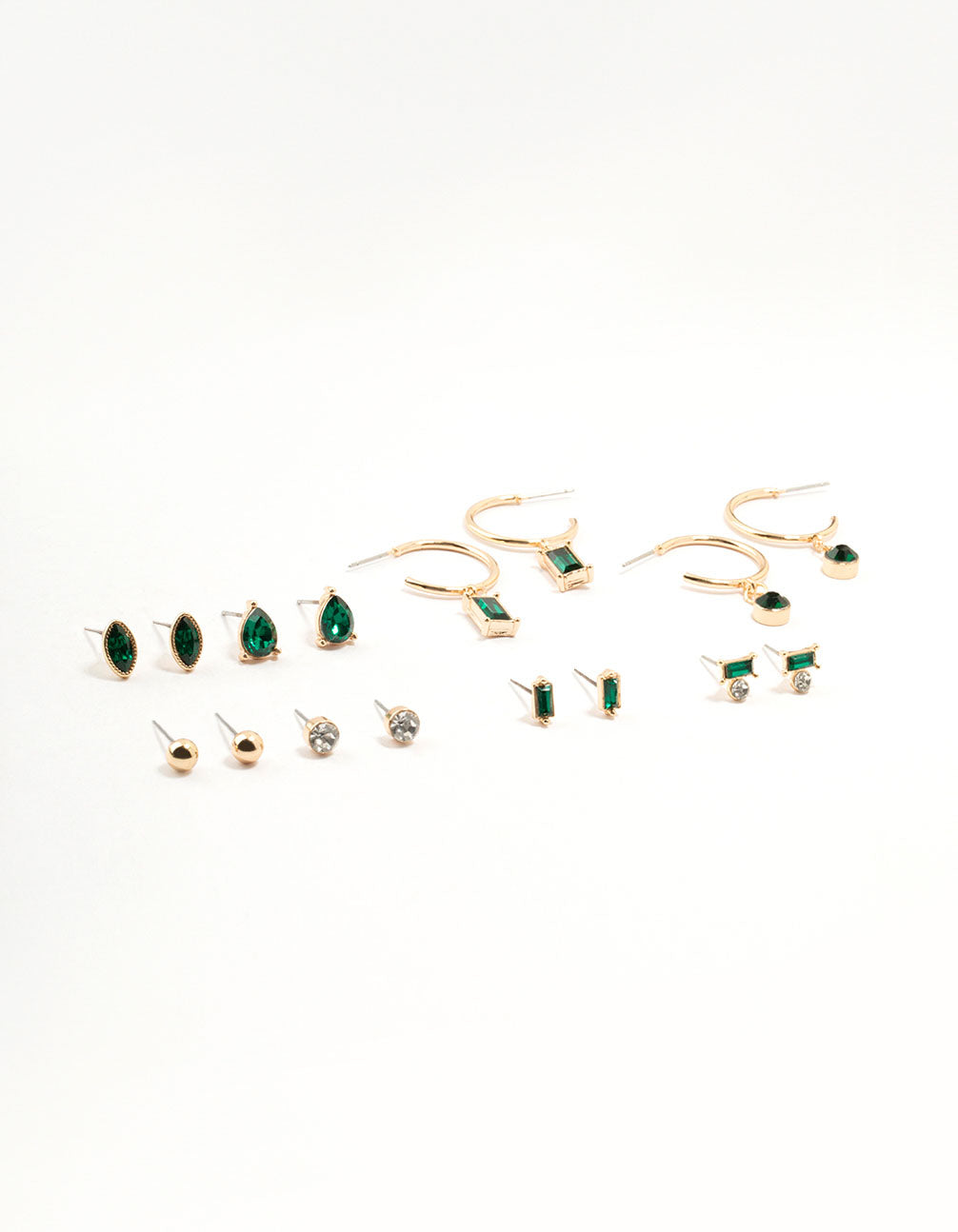 Up your ear stack with a burst of vibrant emerald green from this set of 8 earrings. Featuring baguette cuts, pear-shaped diamantes, sleek designs, and sparkling crystals, these pieces add a striking touch of color and sophistication to any ensemble.