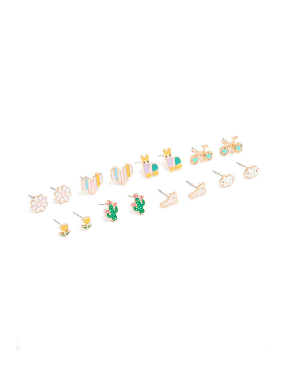 Brighten up your accessory game with this Gold Flower & Bike Stud Earrings Pack! This playful jewellery set is packed with personality, featuring pastel flower studs, multicoloured hearts, fun llama studs, cactus designs, smiley clouds, and even blue bike wheels. Perfect for mixing and matching, these gold-toned stud earrings add a pop of fun to any outfit. Whether you're heading to a festival in a floral dress or just spicing up your everyday jeans-and-tee combo, this set has something for every vibe. Lightweight and versatile, they're ideal for casual outings, or weekend adventures. With cute, colourful designs and a youthful feel, these earrings are a great way to express your style.