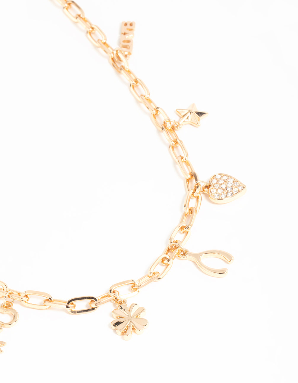 Turn up the charm with this gorgeous gold-toned necklace! Featuring pretty charms like four-leaf clovers, horseshoes, stars, and hearts, it's perfect for adding a touch of luck to your look.