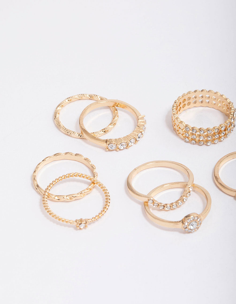 Complete your outfit with this set of twelve, gold-toned rings. This pack contains a mix textured and diamante-studded rings, perfect for adding dimension and interest to your stack.