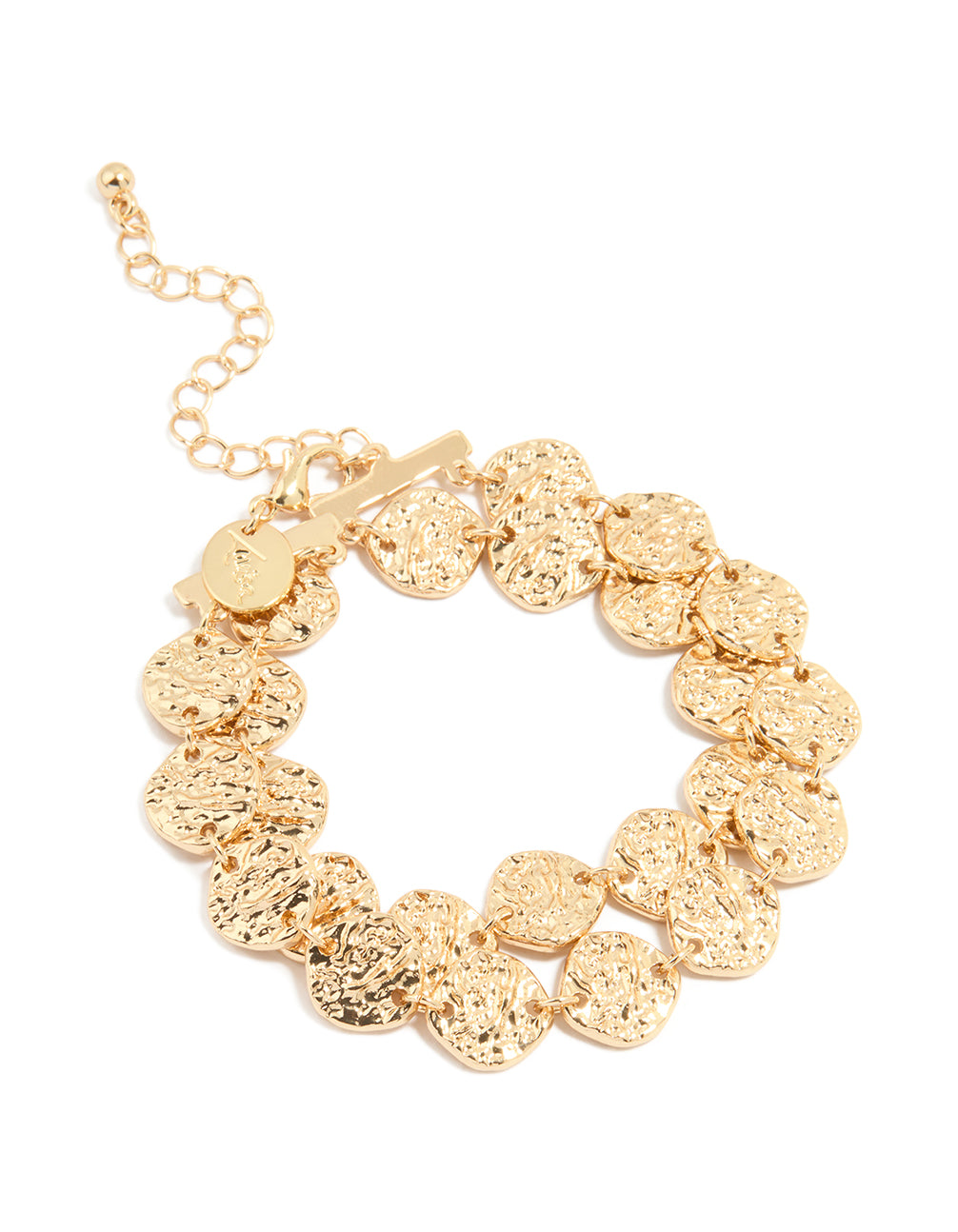 Add a touch of effortless elegance to your look with this Gold Hammered Disc Layered Bracelet. Featuring double-row layers of textured hammered discs, this bracelet is a chic choice for stacking or wearing solo. Perfect for day-to-night styling, it pairs beautifully with casual jeans-and-tee combos or dressed-up evening wear. The gold finish adds warmth and shine, making it a versatile jewellery piece ideal for parties, brunches, or even a chic office look. Whether you're accessorising for a wedding or elevating your everyday outfit, this layered bracelet is your go-to for timeless style.
