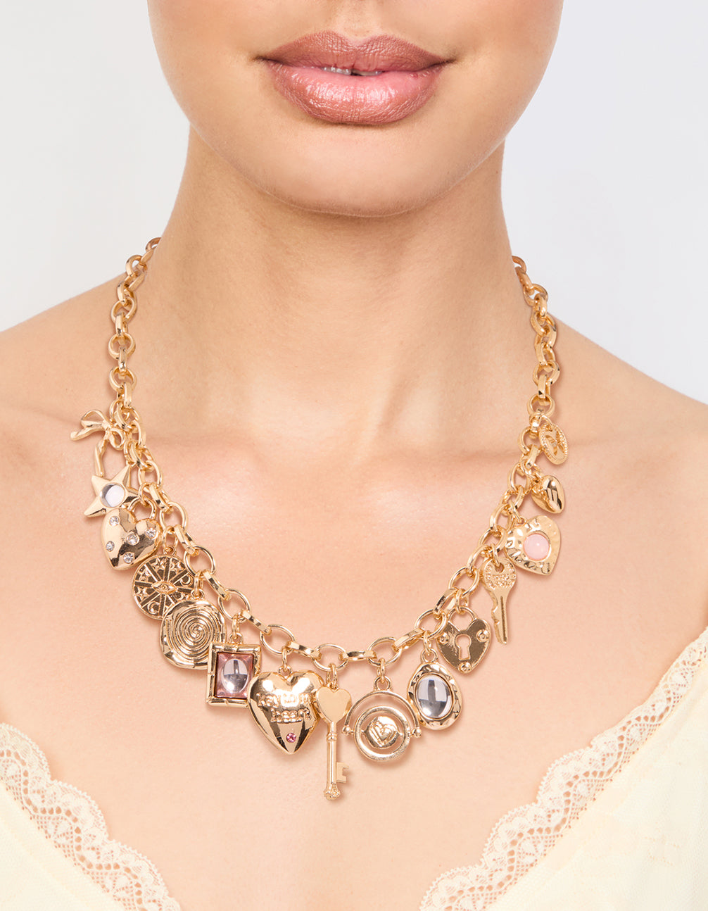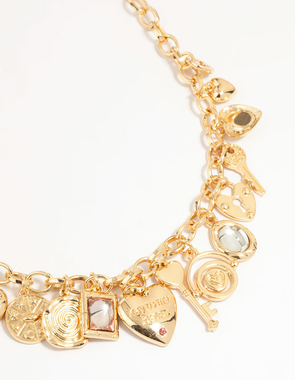 Unlock fun with the Gold Heart & Key Charm Necklace! This charming pendant features heart and key charms, along with other delightful charms. Perfect for layering or wearing solo, it transitions from casual to chic.