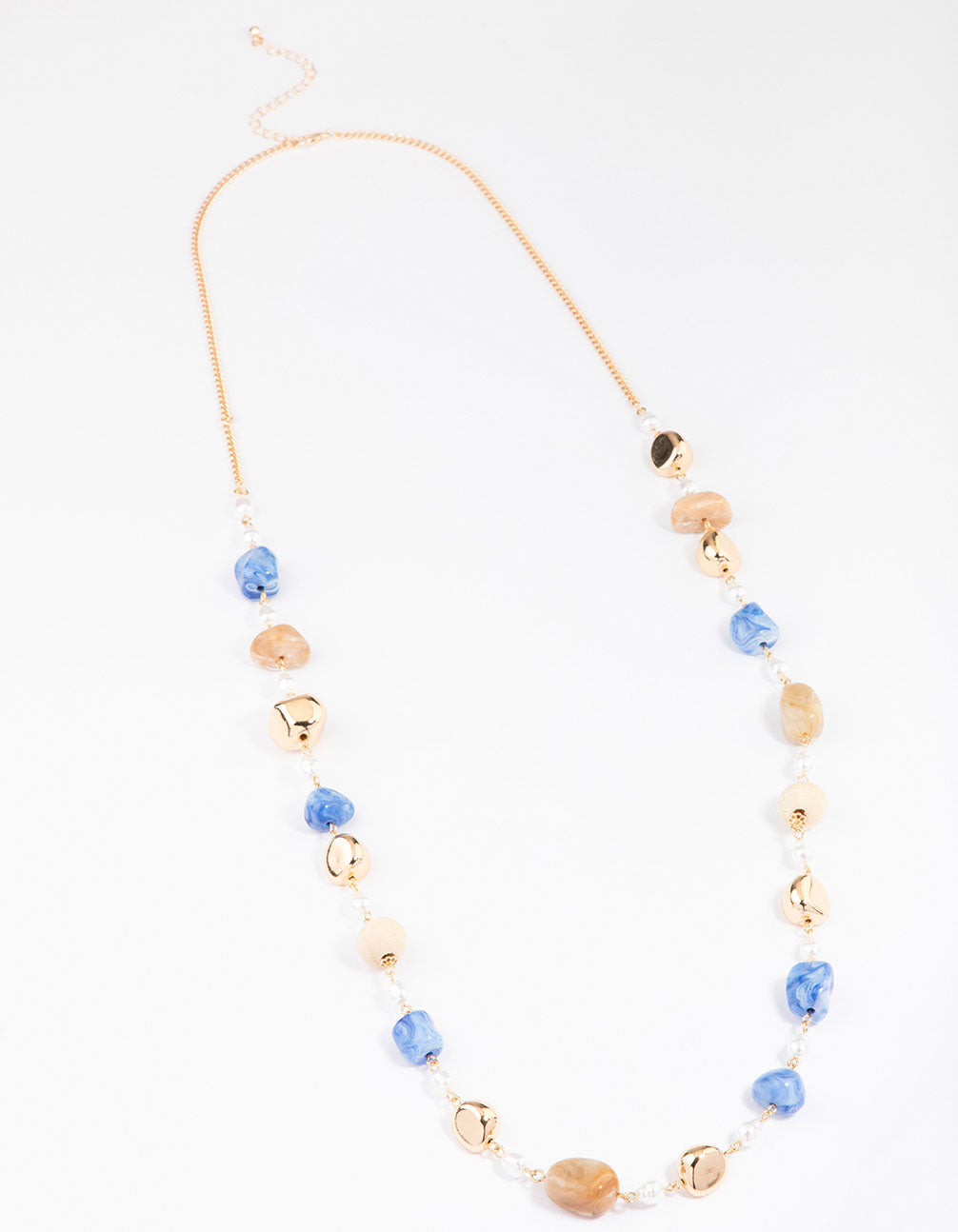 Accessorise like you're on vacation with this long, dainty chain necklace. This necklace features a long silhouette, adorned with blue and gold stones for a textural touch.