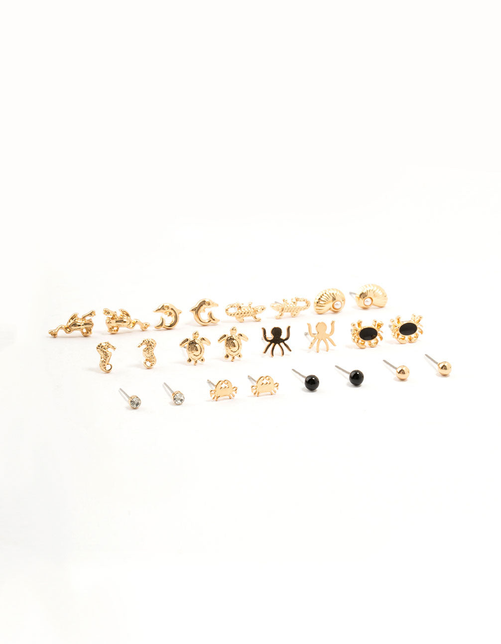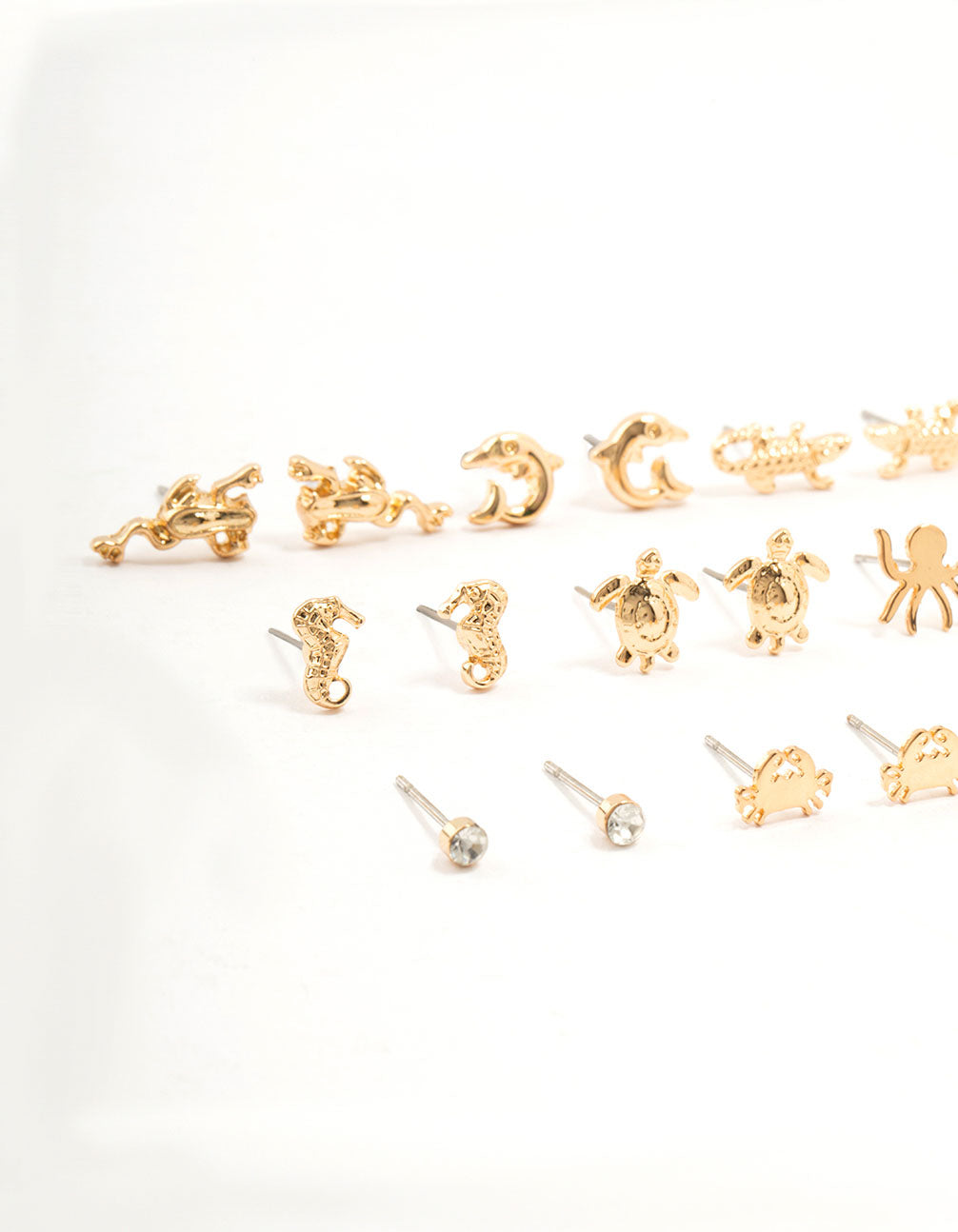 Calling all animal lovers! This set of 12 gold-toned earrings showcases a variety of sea creature designs. Ideal for ocean enthusiasts, this collection adds a touch of simplicity and charm to any look.