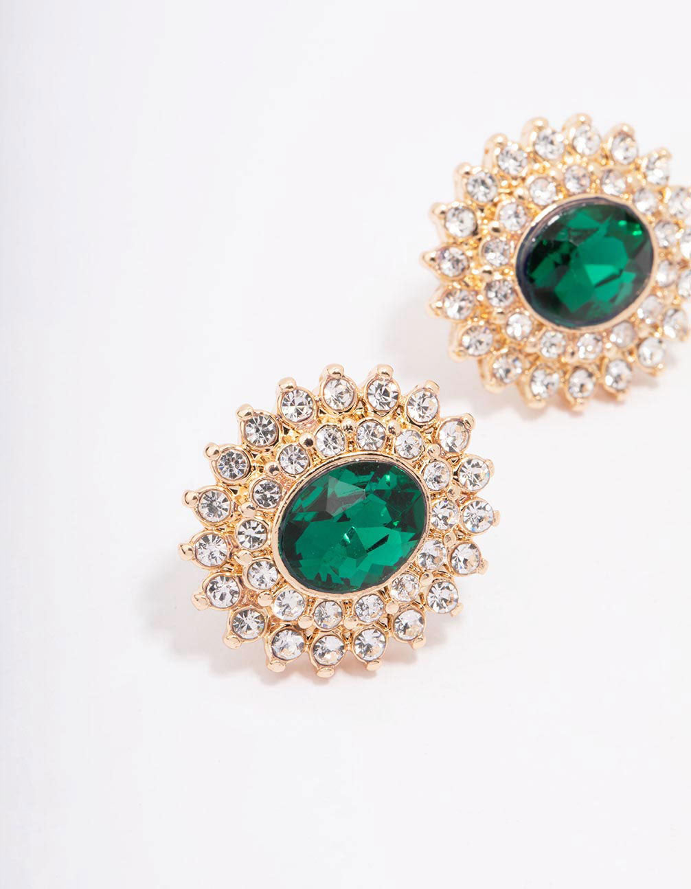 Channel Old Hollywood Glamour with our collection of eclectic jewellery pieces. These unique stud earrings feature a circular, emerald stone surrounded in a halo of mini diamantes for a touch of glamour.