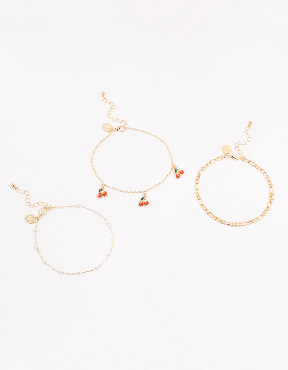 Elevate your ankles with this captivating trio of gold anklets featuring pearl accents and a cheeky cherry design. Perfect for beach days or nights out, they add whimsical charm to any outfit.