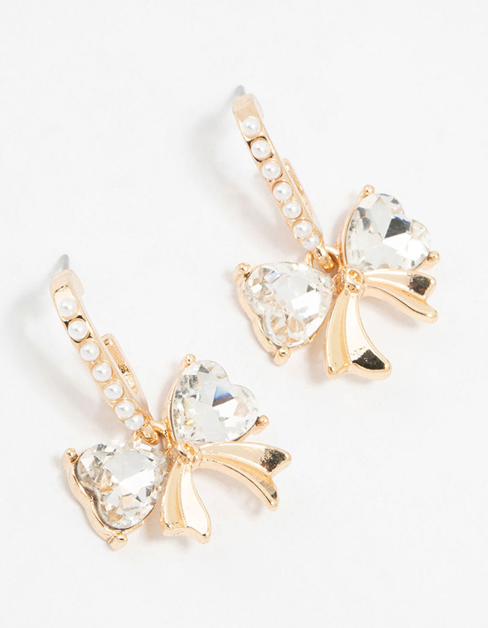 Add a flirty touch with these gold toned hoops! Featuring chic pearls and a diamante bow design, they're perfect for a playful yet elegant look.