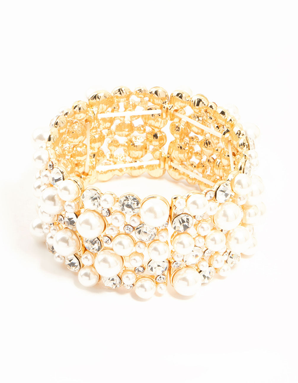 Bring some sophistication to your wrist stack with this gold toned stretch bracelet. This gold toned bracelet features chic pearls and diamantes and is perfect for an elegant look..
