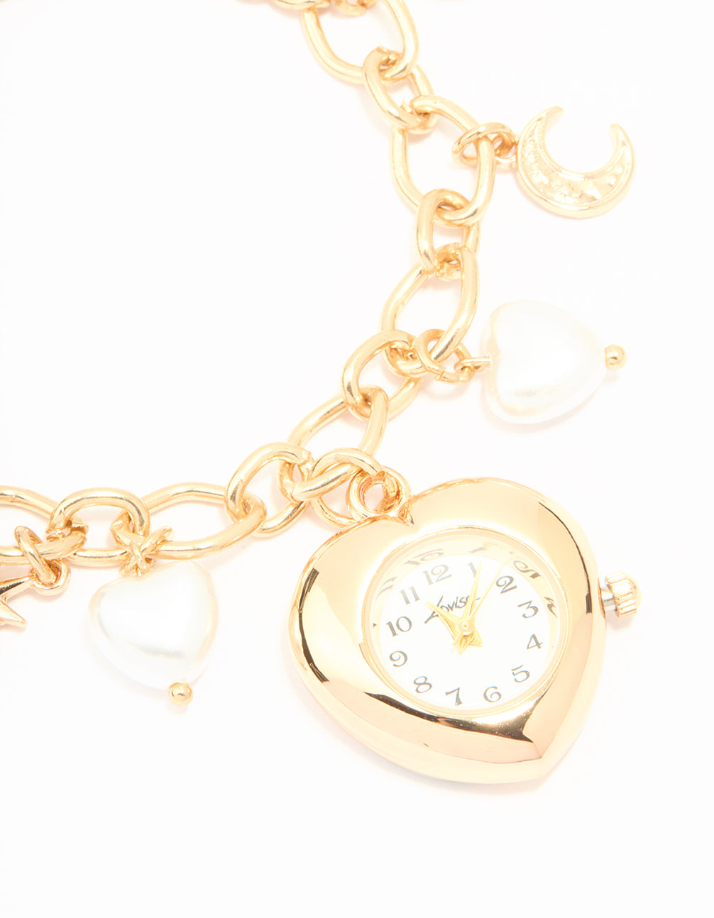 Keep your style on point and your timing perfect with this Gold Pearl Heart Charm Watch Bracelet. Decorated with lustrous pearls, heart-shaped charms, a sparkling red diamante-centred star, and a textured moon and a fun, functional watch charm, this bracelet is a celestial dream. Crafted with a chic gold finish, it's ideal for adding a glamorous touch to evening looks, whether you're heading to a party or a romantic dinner. Pair it with a sleek dress or a tailored jumpsuit for effortless sophistication. A stunning combination of a bracelet and a watch, it's the perfect accessory to elevate your outfit while keeping you stylishly on time.