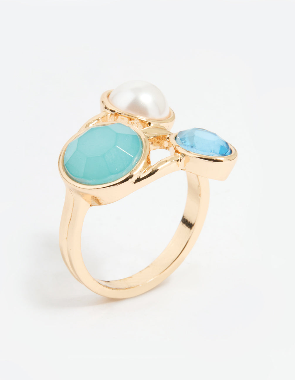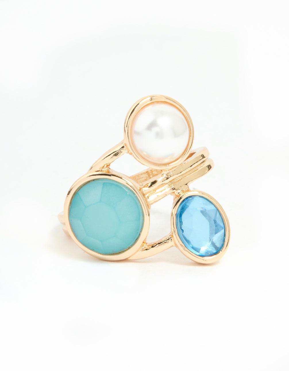 Gold Pearl Statement Triple Blue & Clear Gems Ring