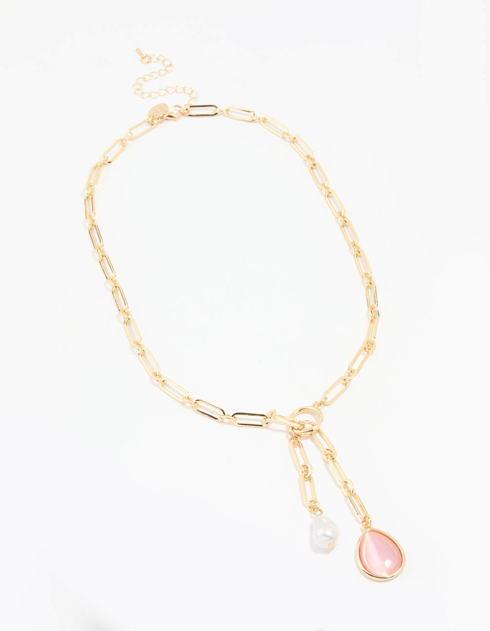 Gold Pink Gem & Pearl Drop Y-Necklace