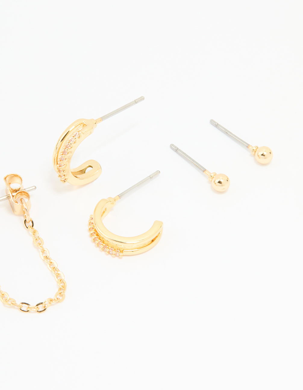 Gold Plated Brass Cubic Zirconia Heart & Chunky Huggie Earrings 4-Pack