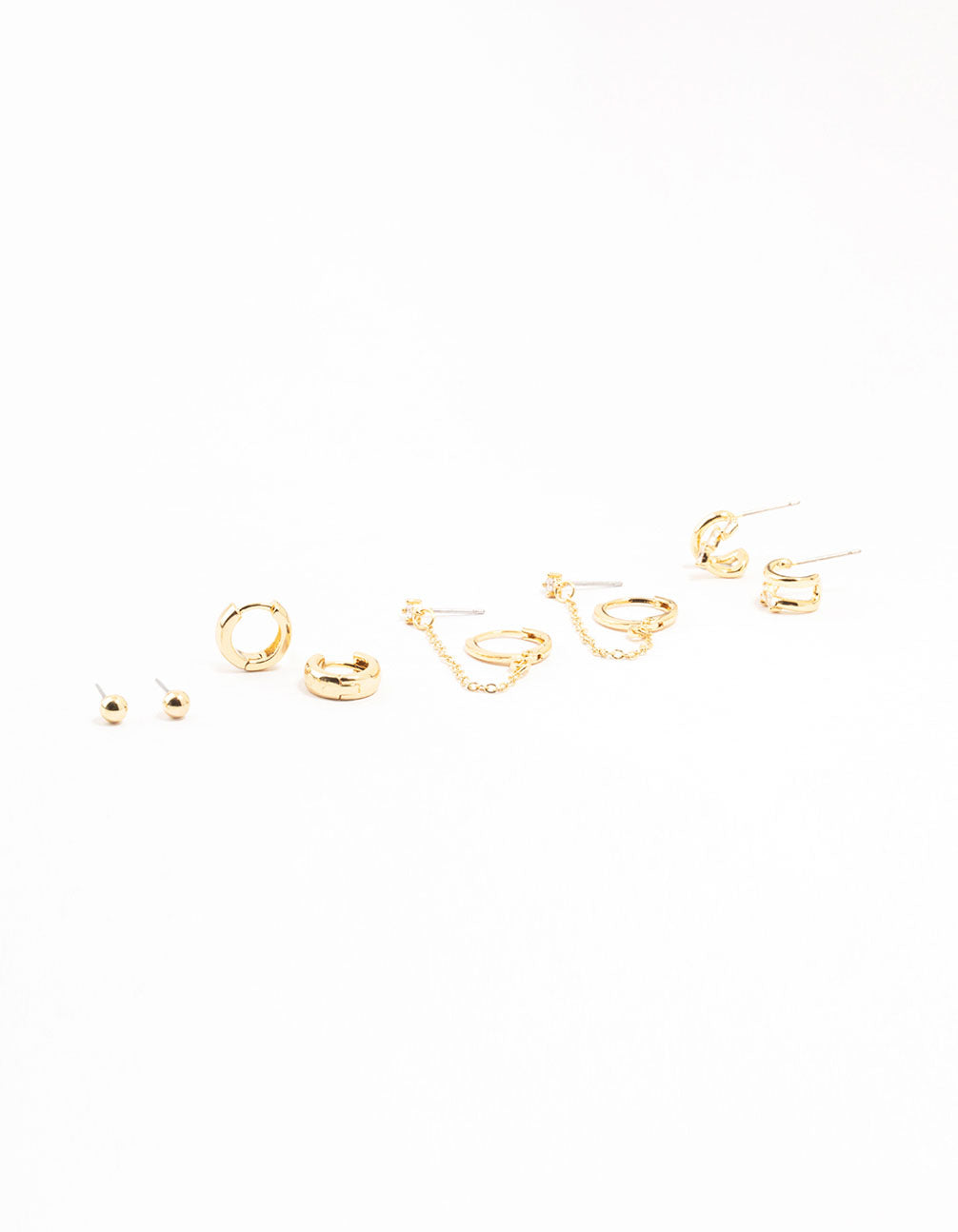 Create your own ear party with this set of five fabulous gold-plated earrings! From edgy chains to sleek studs and cool cut-out hoops, stack 'em up or rock 'em solo for a chill vibe.