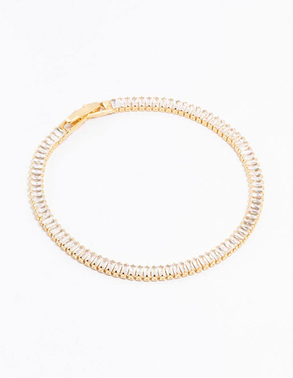 Add glamour with this Gold Plated Tennis bangle featuring striking Cubic Zirconia stones, cut to replicate real diamond in a stunning baguette stone design.