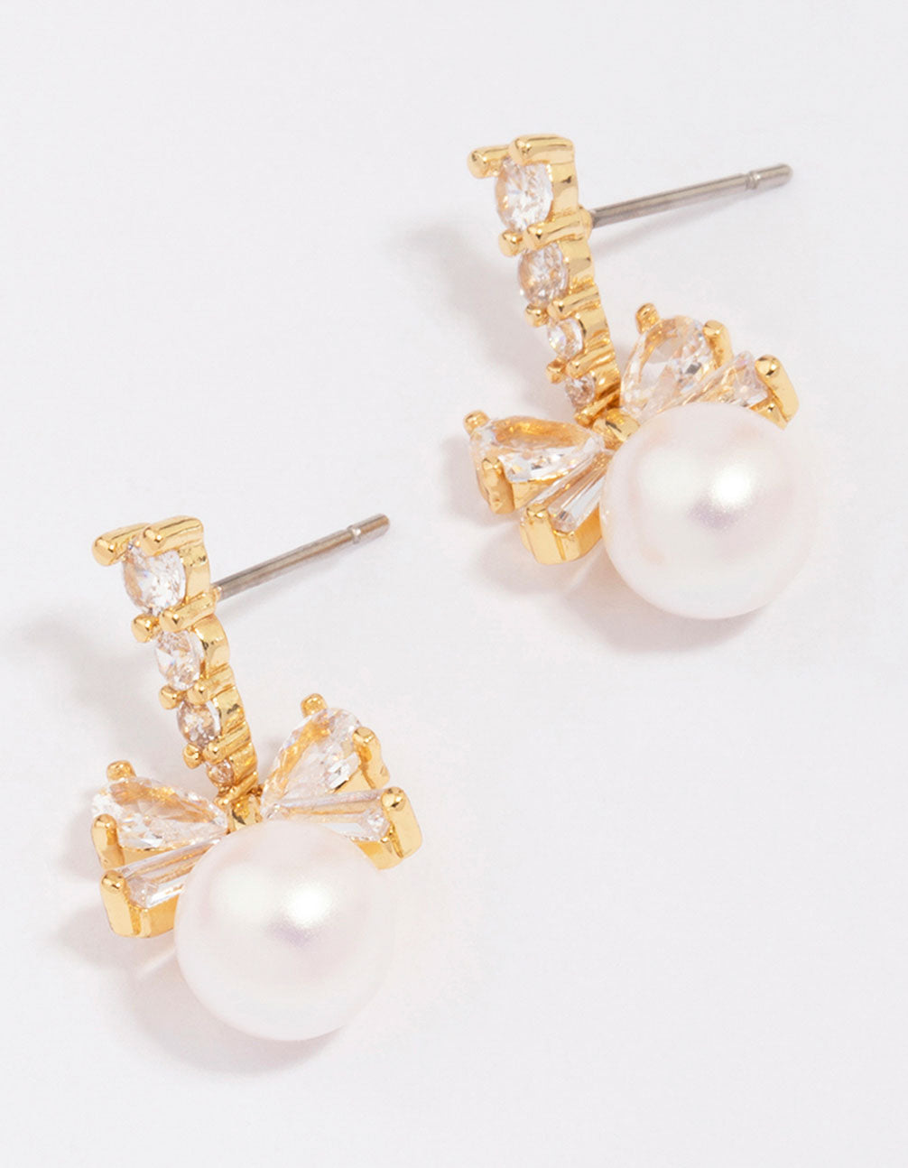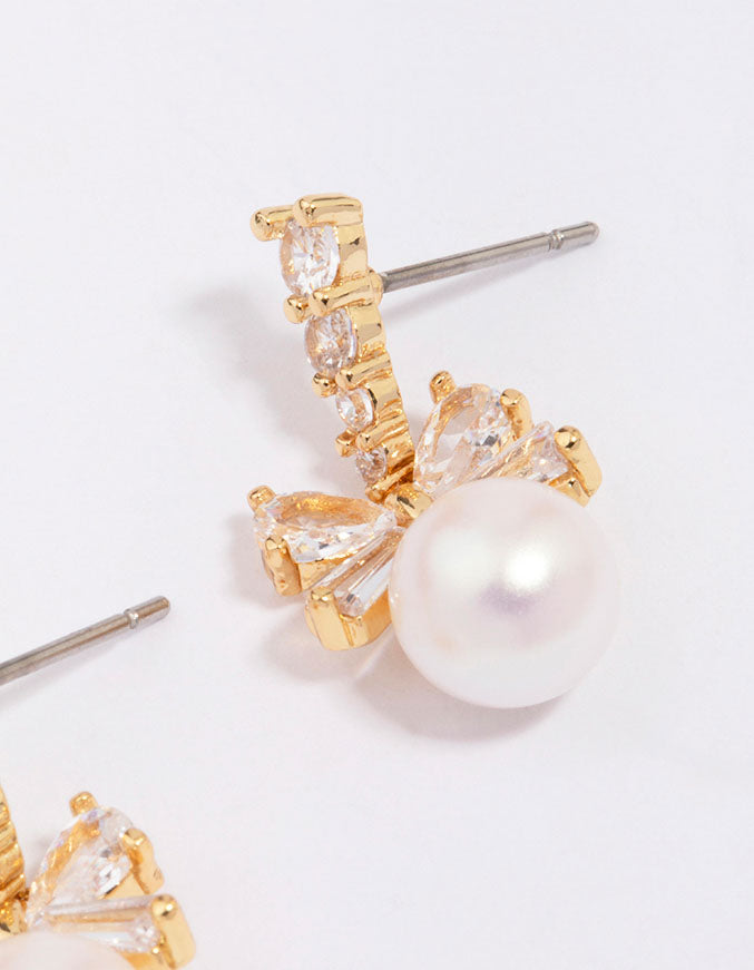 Gold Plated Cubic Zirconia Bow & Pearl Drop Earrings