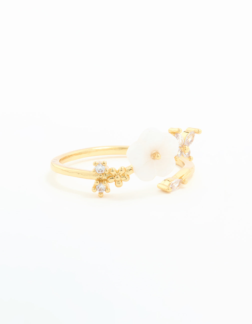 Add a touch of elegance and charm to your jewellery collection with this Gold Plated Cubic Zirconia Lovely Flower Wrap Around Ring. This ring features a wrap-around design that delicately curves around your finger, adorned with shimmering cubic zirconia crystals arranged in a delightful flower shape. Its gold-plated finish gives it a polished, luxe look, making it perfect for any occasion, from casual coffee dates to special evening events. Whether you're pairing it with other rings for a stylish stacked style or letting it shine solo, this versatile piece adds a youthful yet sophisticated vibe to your outfit. Ideal for those who love floral-inspired jewellery, this wrap ring is a must-have accessory to elevate your day-to-night wardrobe.