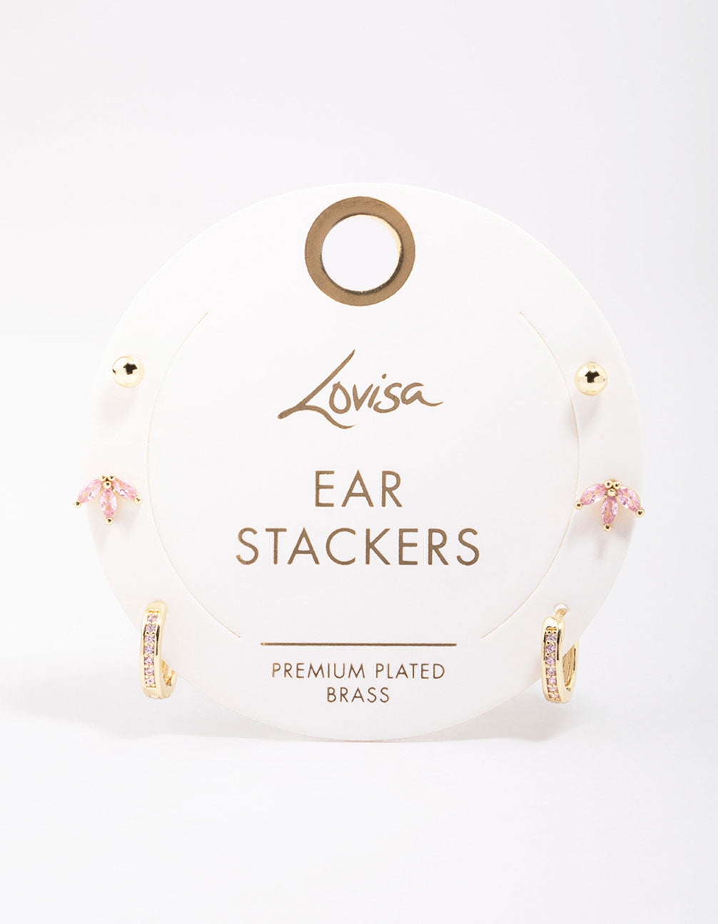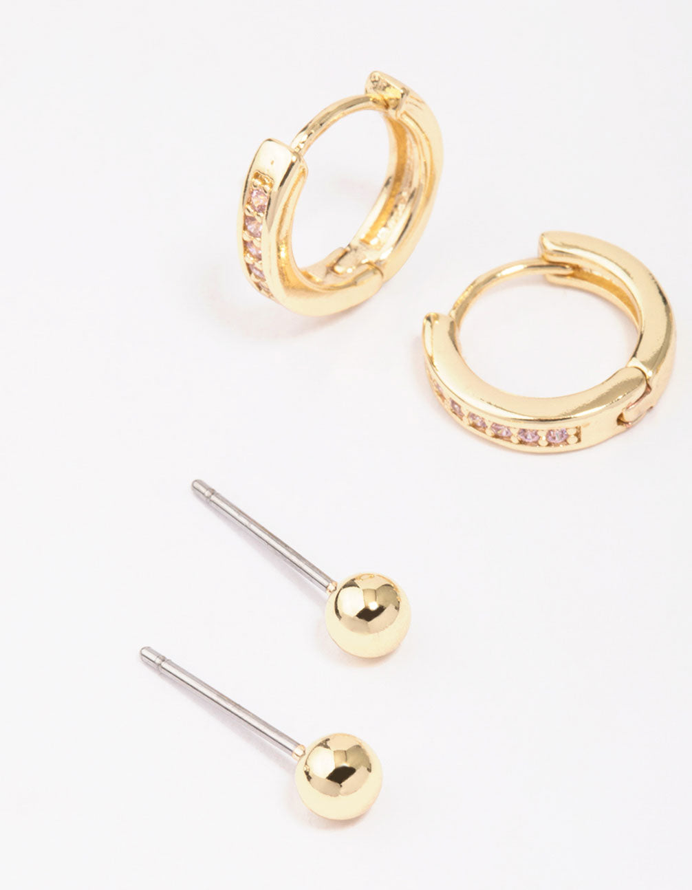 Curate the stack of your dreams with this timeless, gold plated brass earring set. This earring pack includes two pairs of studs and a set of adorning hoops to match.