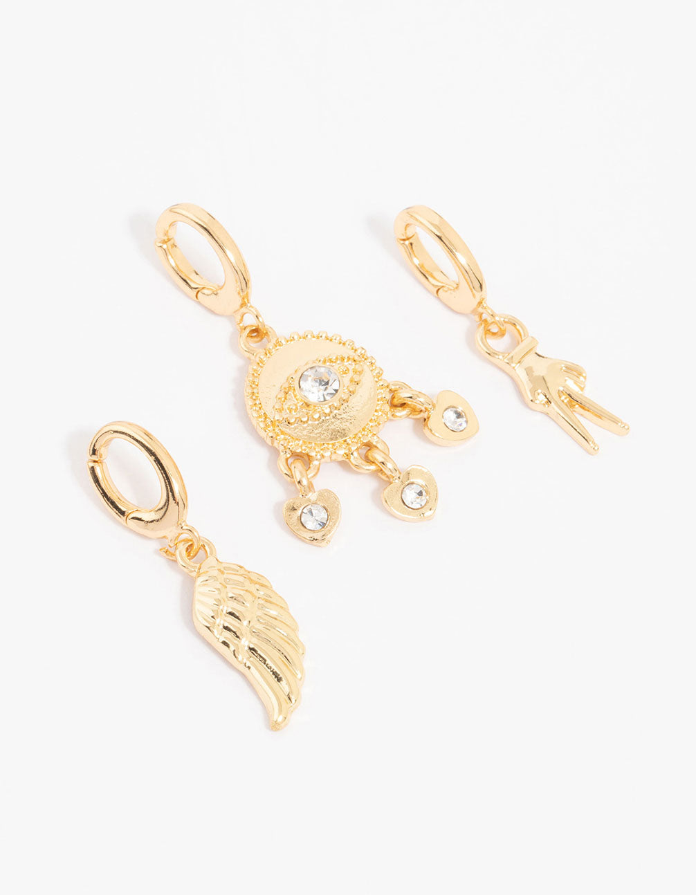 Upgrade your charm bracelet or necklace with this gold-plated set! Featuring a sparkly diamante eye, an angel wing, and a hand-shaped charm, it's a must-have for a cool look.