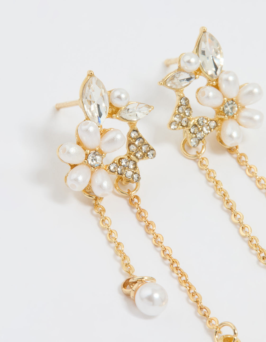 Gold Plated Diamante Pearl Flower Chain Drop Earrings