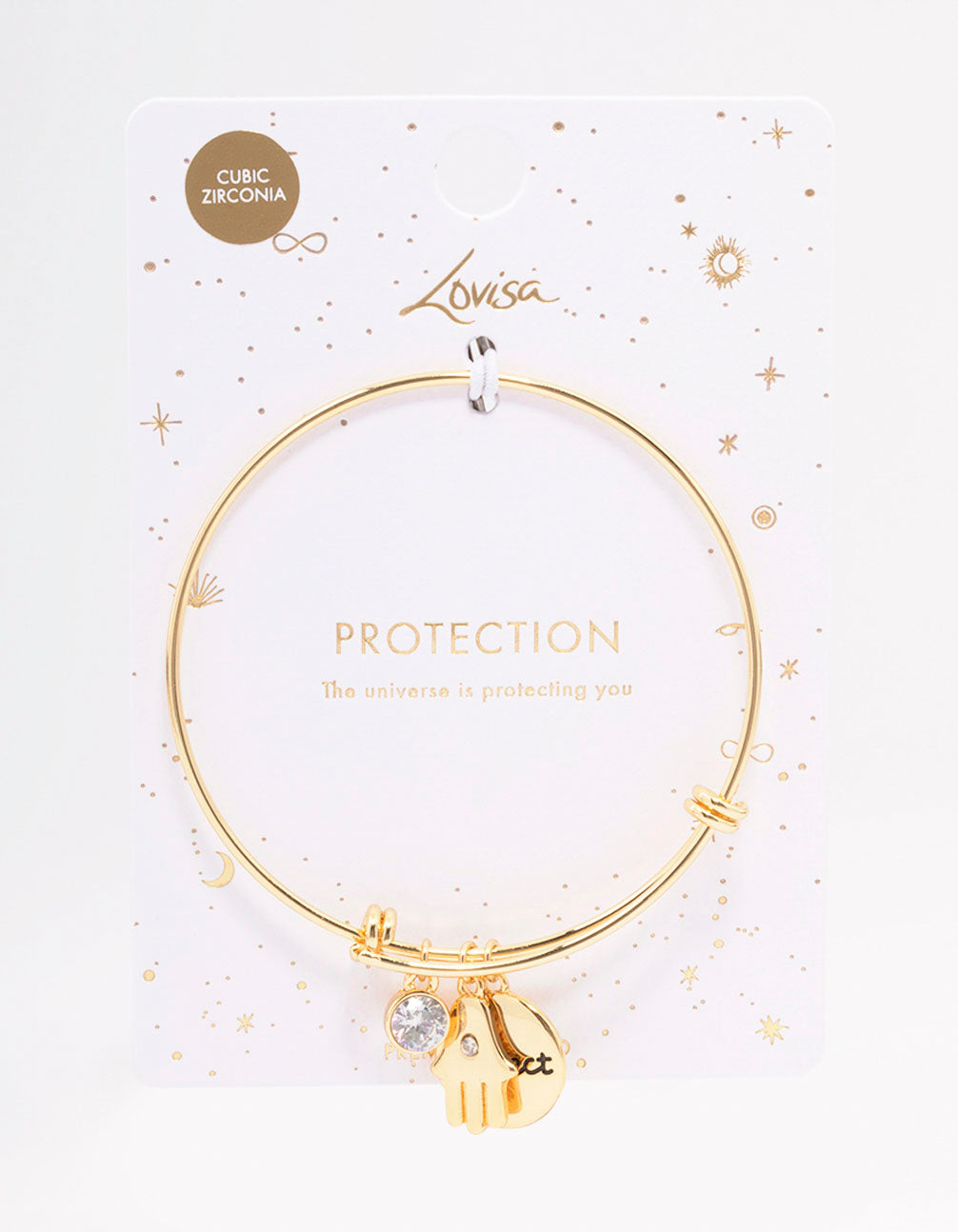 Protect your energy with this gorgeous, gold plated bangle. This simple charm bangle is plated with real gold and features a thin, overlapping profile.