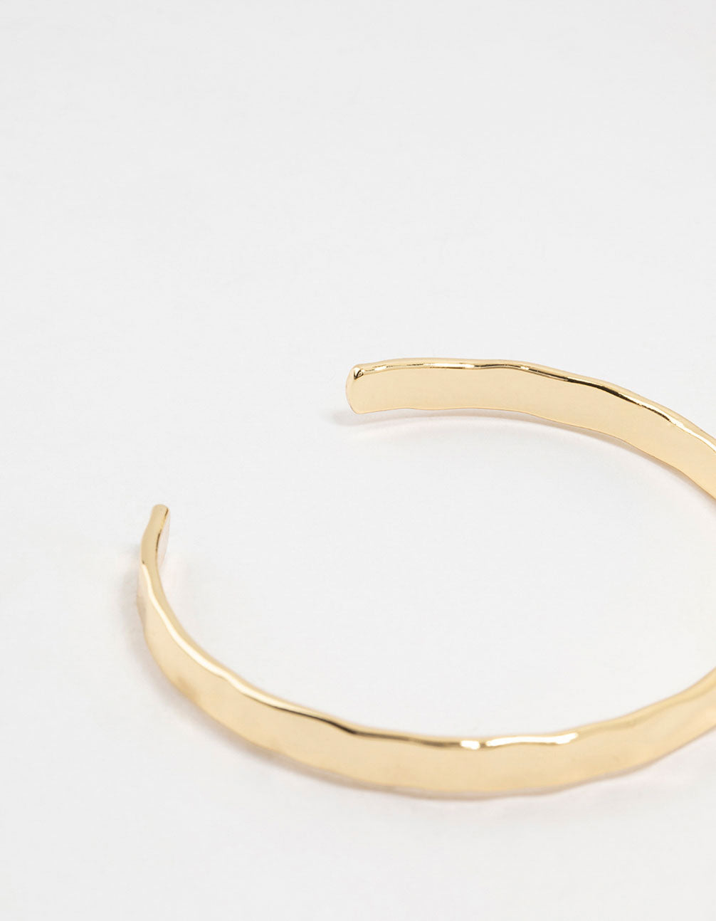 This striking gold-plated bangle blends modern edge and timeless sophistication. This luxe piece features a bold, hammered texture. Slip it on solo or stack it with other bracelets for a statement-making arm party that commands attention.