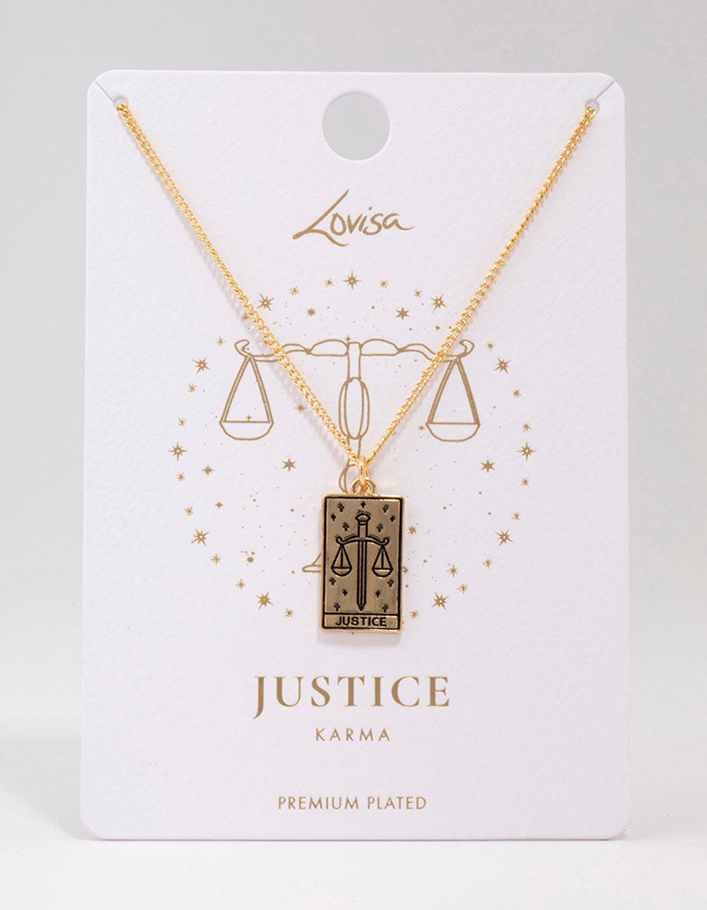 Gold Plated Justice Tarot Card Pendant Necklace