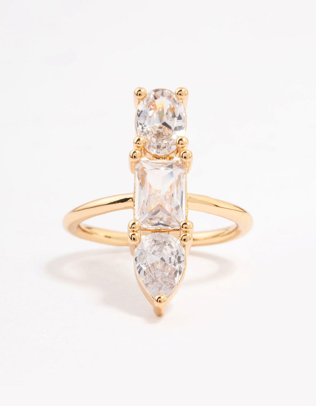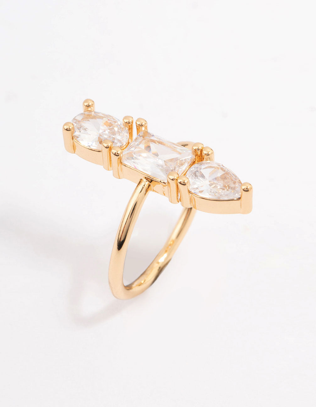 For a signature touch to your stack, style this gold plated cocktail ring. This unique ring features a dainty band, adorned with a linear-shaped, cubic zirconia crystal.
