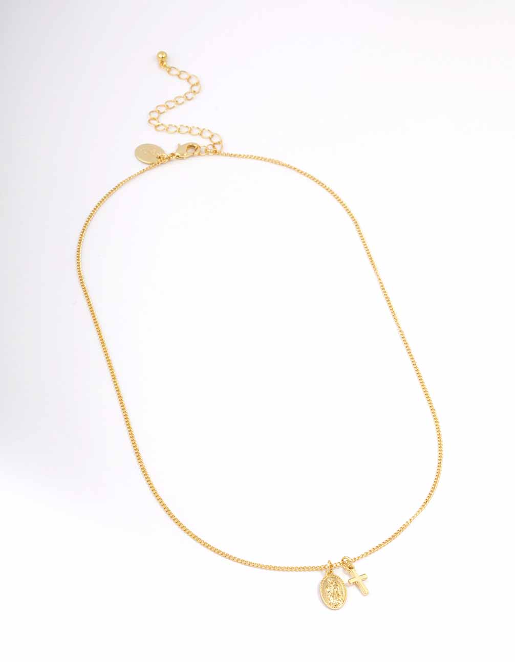 This fine gold necklace features two dainty charms, including a coin pendant and cross motif.
