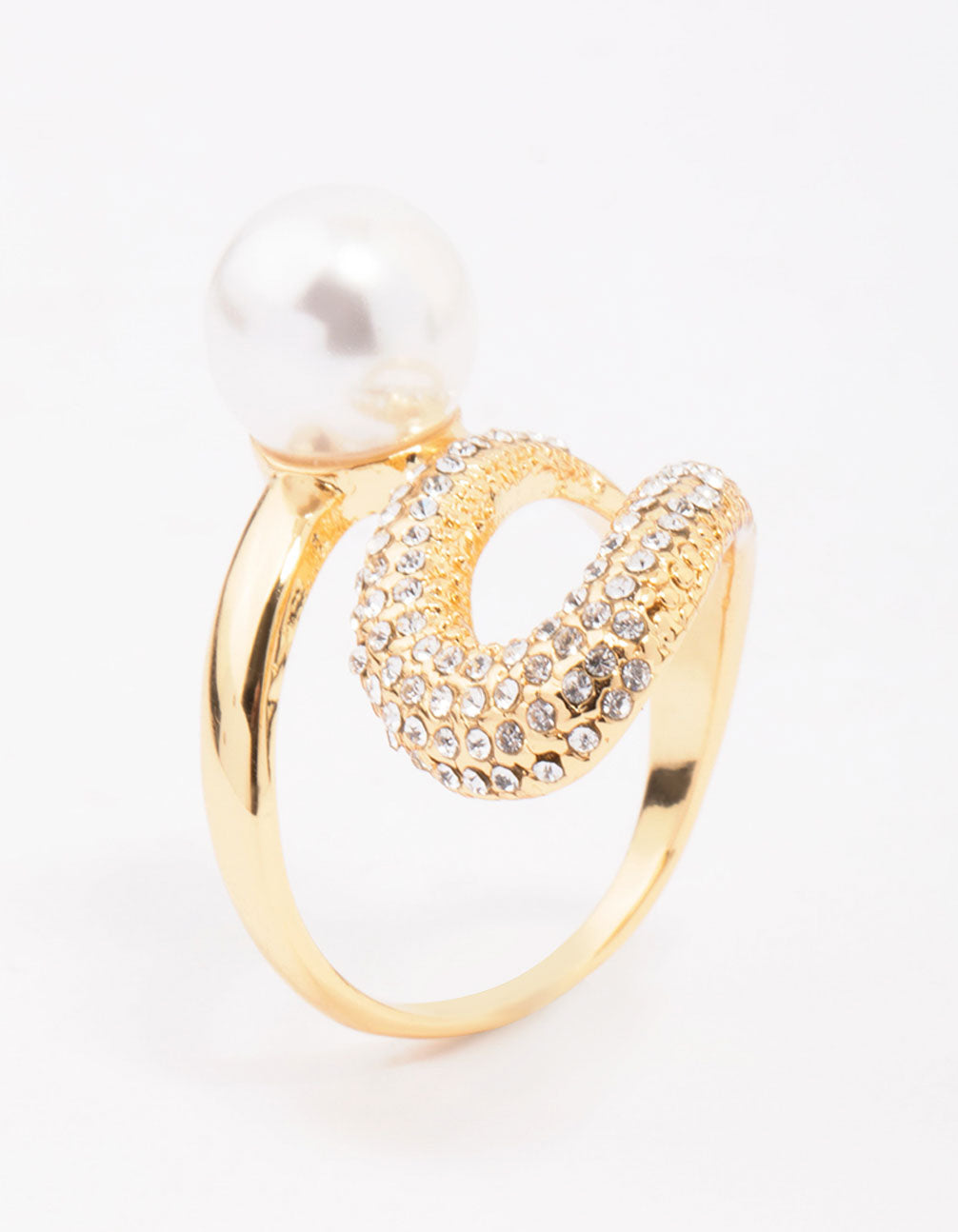 For a glamorous edition to your stack, style this gold plated cocktail ring. This ring features a swirling silhouette, encrusted with cubic zirconia crystals and a round pearl in the centre for a glamorous touch.