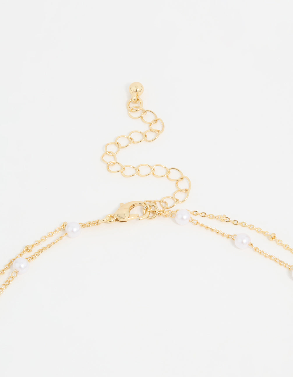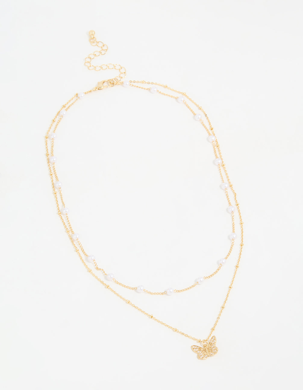 Shine with this Gold Plated Pearl Butterfly Layered Necklace! This delicate piece features a sparkling butterfly pendant layer and a pearl later, perfect for any occasion. Pair it with any outfit for a touch of elegance and charm.
