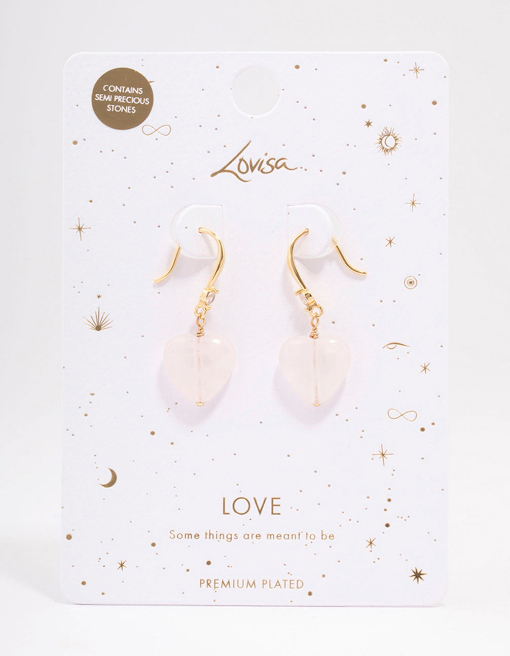 These simple drop earrings are plated with real gold and feature heart-shaped, rose quartz stones.