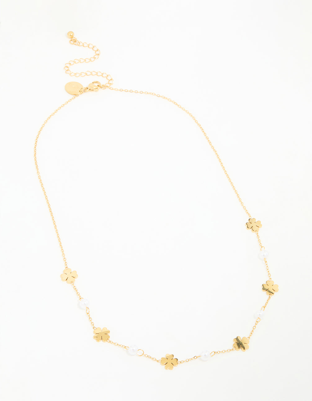 Waterproof Gold Plated Stainless Steel Pearl & Clover Pendant Necklace