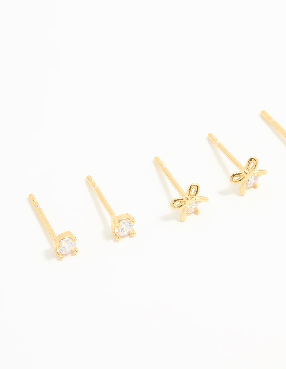 Upgrade your accessory game with the Gold Plated Sterling Silver Bow & Sleek Earrings 3-Pack! This set includes bow studs, diamante studs, and minimalistic gold studs. Crafted from gold plated sterling silver, they're perfect for everyday wear.