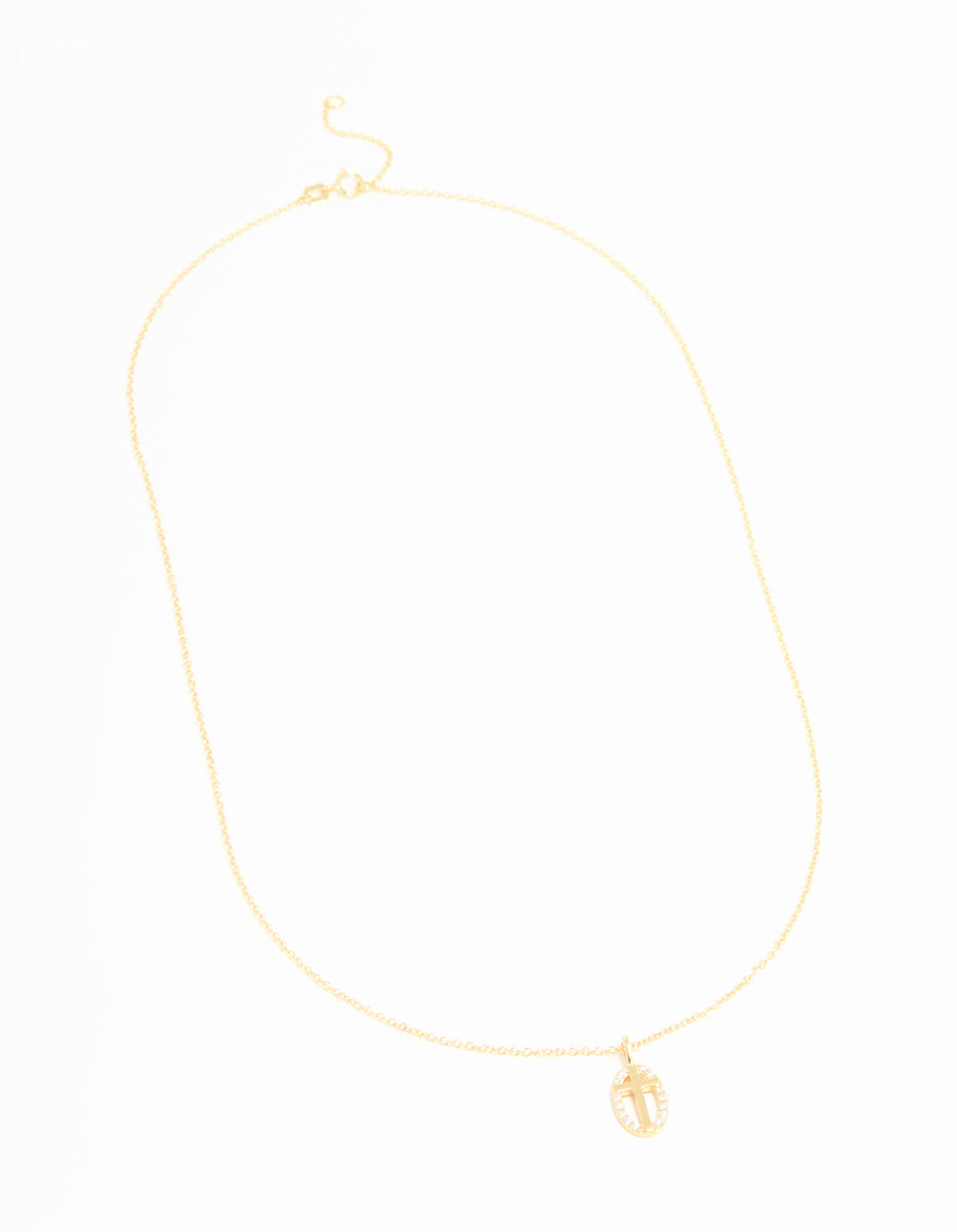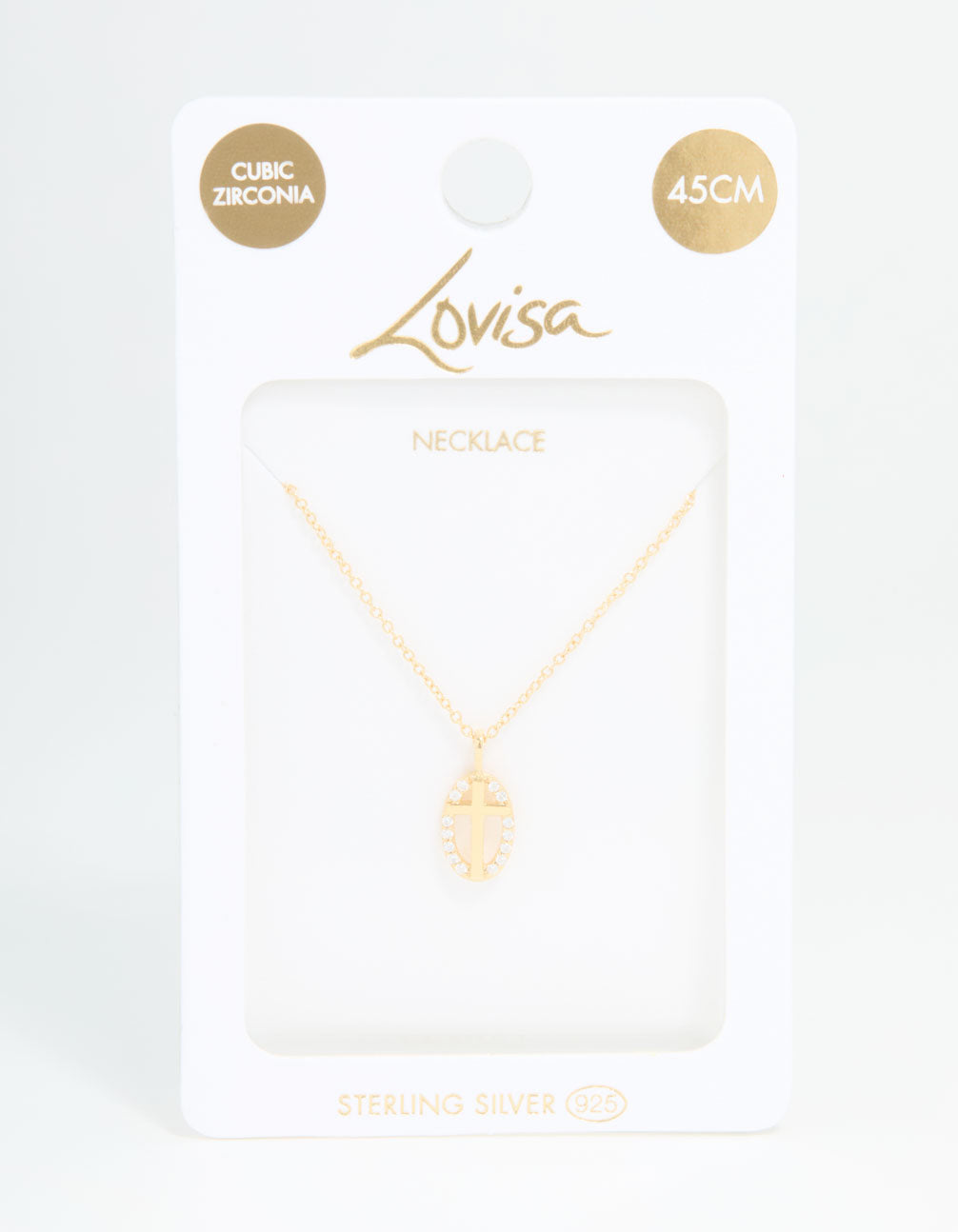 Gold Plated Sterling Silver Cubic Zirconia Oval Cross Necklace