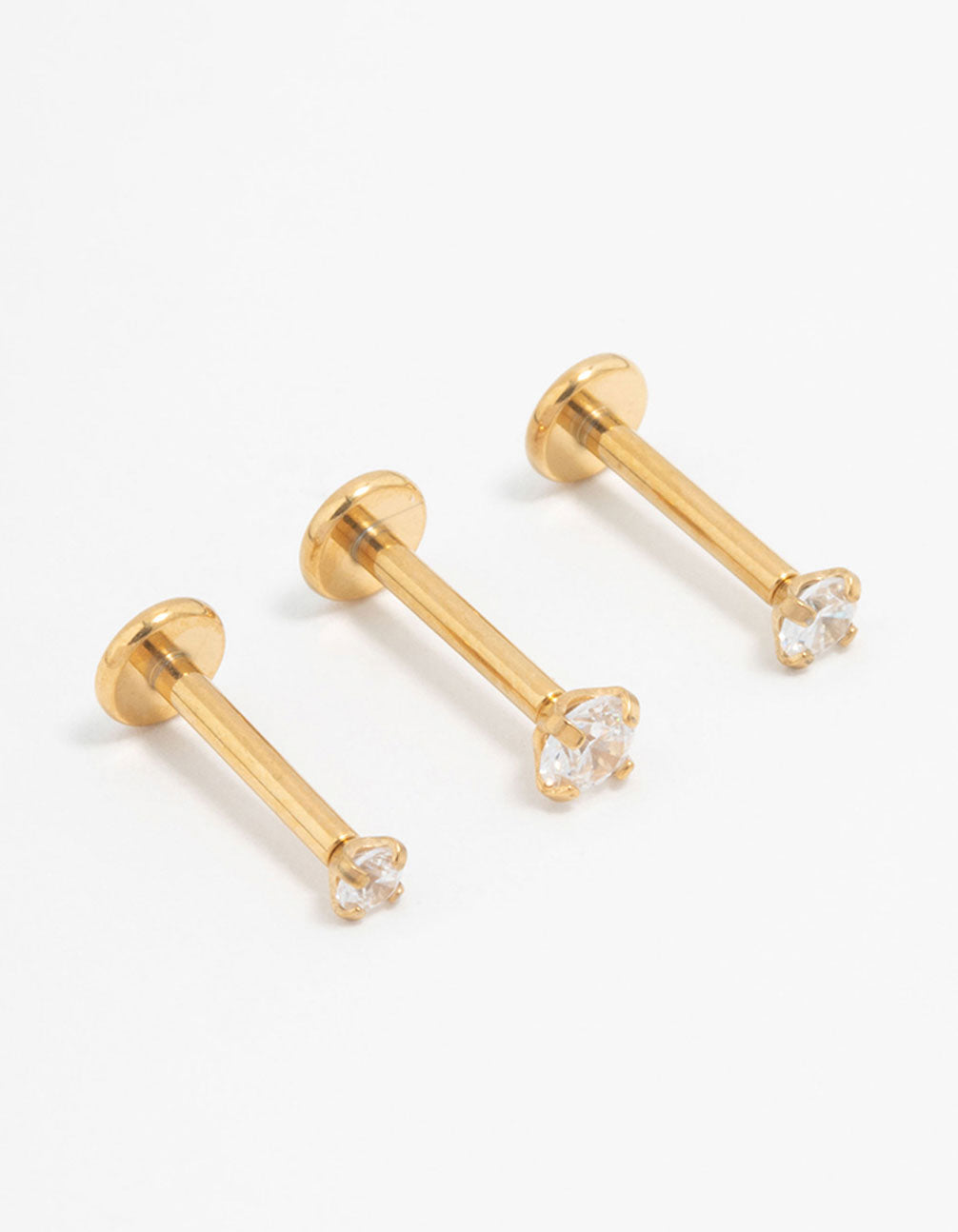 Keep it classic with this flat back trio! Use this set of three comfy gold-plated surgical steel studs with cubic zirconia crystals for a sleek, timeless look.